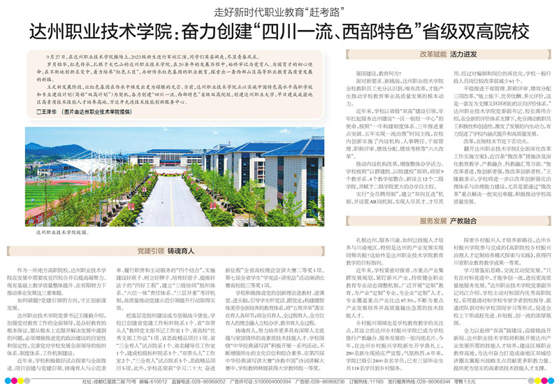 立足新发展阶段,让红色基因在传承中焕发出更为耀眼的光芒。当前,达州职业技术学院正以实施中国特色高水平高职学校和专业建设计划(简称“双高计划”)为契机,奋力创建“四川一流、西部特色”省级双高院校,创建达州职业大学,早日建成成渝地区高素质技术技能人才培养高地、万达开先进技术技能创新服务中心。