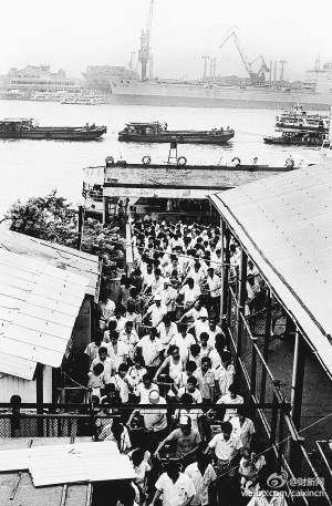 时针很快指向8点,不知不觉中,太阳穿透了浓雾,天地为之开朗。这时,渡口外的百米通道上已经站满了黑压压的人群。进入上班高峰期以后,乘客的人数可以说是呈几何级数地增长。到8点,渡站内外已经聚集了二三万人。中国是个人口众多的国家,上海又是中国人口密度最高的地区,因此对人的数量有种麻木感。二三万人,在上海人听起来好像区区一个小数,根本不当一回事。到9点开航时,人数又增加到4万。面对这样的人群,高音喇叭发出来的声音,就像在海面上掠过的一只鸟,显得那样的渺小。太阳光一亮起来,人潮就自发地向前涌动。