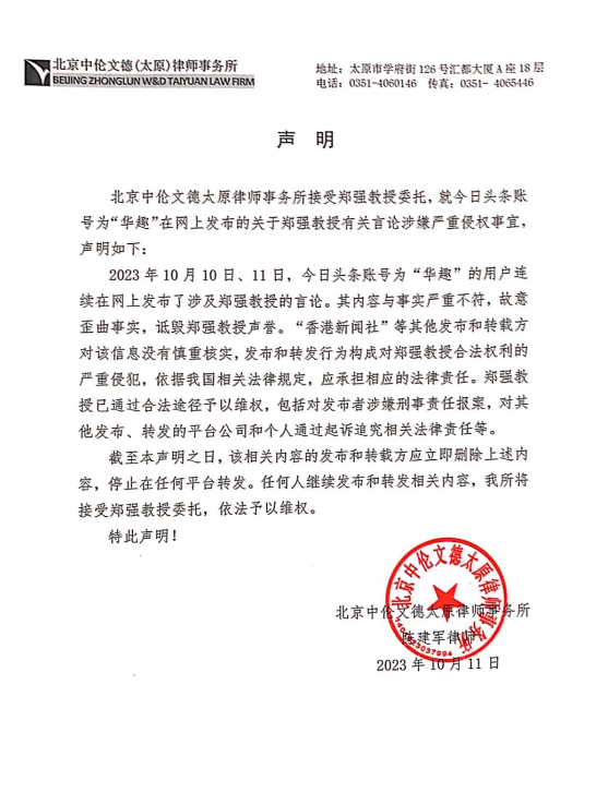 同时,北京中伦文德太原律师事务所接受郑强教授委托发表声明,将依法予以维权。