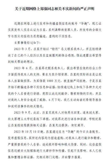 10月12日中午,郑强教授通过微信公号发布声明:近期在网络上进行发布和传播虚假信息的账号“华趣”,现已证实其发布人实名认证为吕某,系刑满释放犯罪人员,所发布的全部文字与图片内容均为恶意编造、虚构的不实信息。