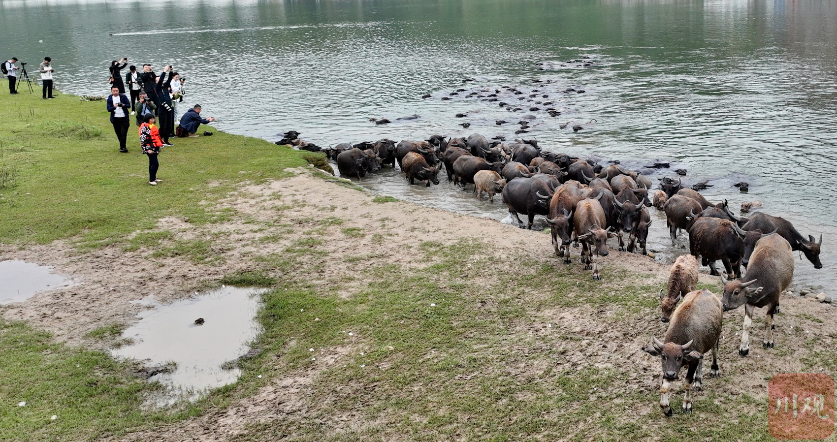 摄影师拍摄“百牛渡江”。