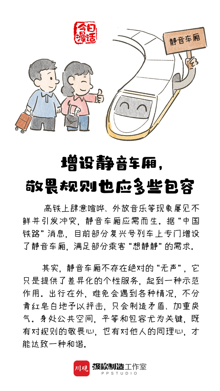 高铁增设静音车厢,提高了服务质量,舒适度更好了,但是乘客一定要敬畏规则,文明乘车。