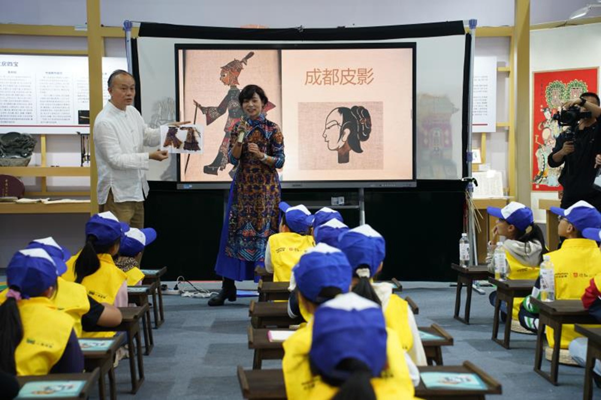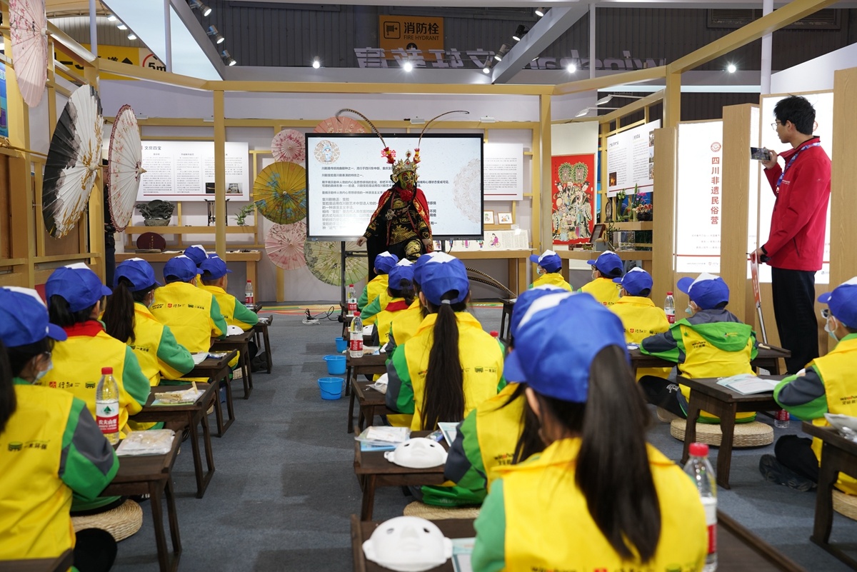 四川文轩行知研学旅行社有限公司总经理周霞介绍,新华文轩与四川省非物质文化遗产保护中心联合开设的“非遗研学”课程将以四川本地非遗传承为核心,激发学生对非遗和巴蜀文化的探知欲,唤醒文化自信。非遗传承人在现场讲授非遗知识与技艺,同学们可以与非遗传承人现场对话,近距离体验非遗之美。本次书展教育服务体验区的“非遗研学”开设有七项课程:川剧脸谱彩绘、灯火皮影制作、木版年画印刷、古韵油纸伞手绘、剪纸技艺、田园草编体验、手掌木偶演艺。这些都是巴蜀地区传统非遗项目。