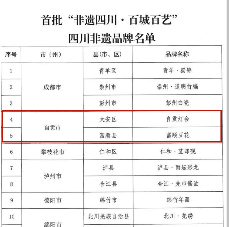 10月13日,川观新闻记者从自贡市文化广播电视和旅游局获悉,日前四川省文化和旅游厅印发《关于公布首批“非遗四川·百城百艺”四川非遗品牌名单的通知》(以下简称《通知》),公布了全省30个入选首批“非遗四川·百城百艺”的非遗品牌名单,大安区·自贡灯会、富顺豆花榜上有名。