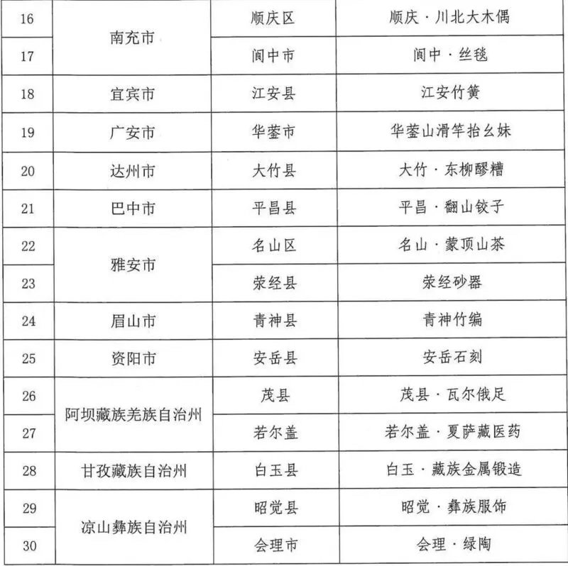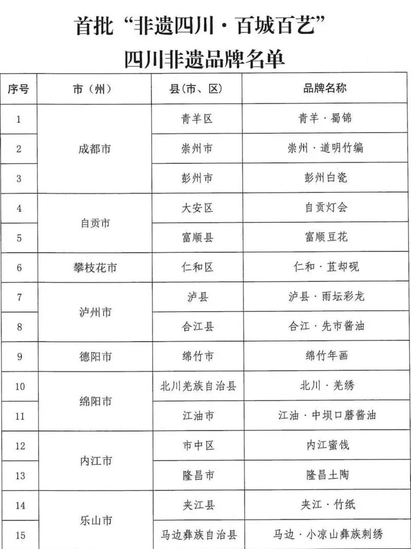 据了解,为加快培育建设四川非遗品牌,增强非遗传承活力,推动四川非遗创造性转化、创新性发展,省文化和旅游厅按照《“非遗四川·百城百艺”四川非遗品牌建设工作方案》,经申报、评审、公示、审核等程序,评选出首批“非遗四川·百城百艺”四川非遗品牌。
