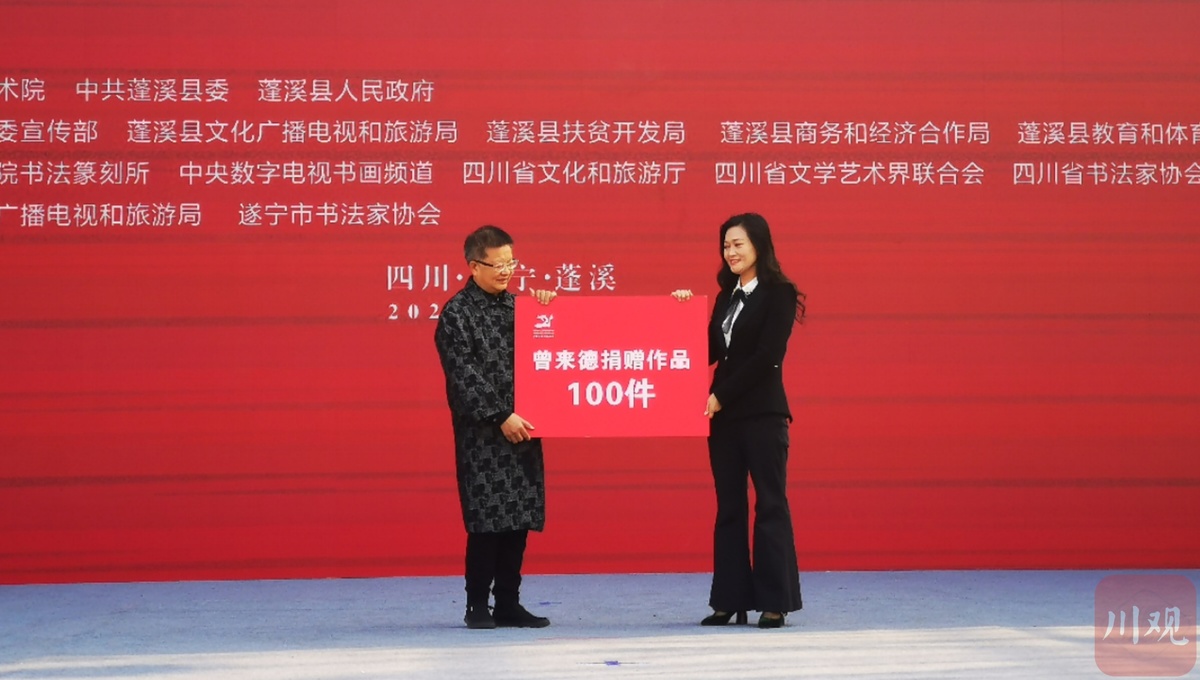 开幕式上,首发“中国书法 蓬溪雅集”主题邮票及纪念信封;中央数字书画频道董事局主席王平为蓬溪县授予“中央数字书画频道拍摄制作基地”牌匾;中国国家画院原副院长、中国国家画院院委、书法篆刻院原执行院长曾来德讲话、捐赠书法作品100件。