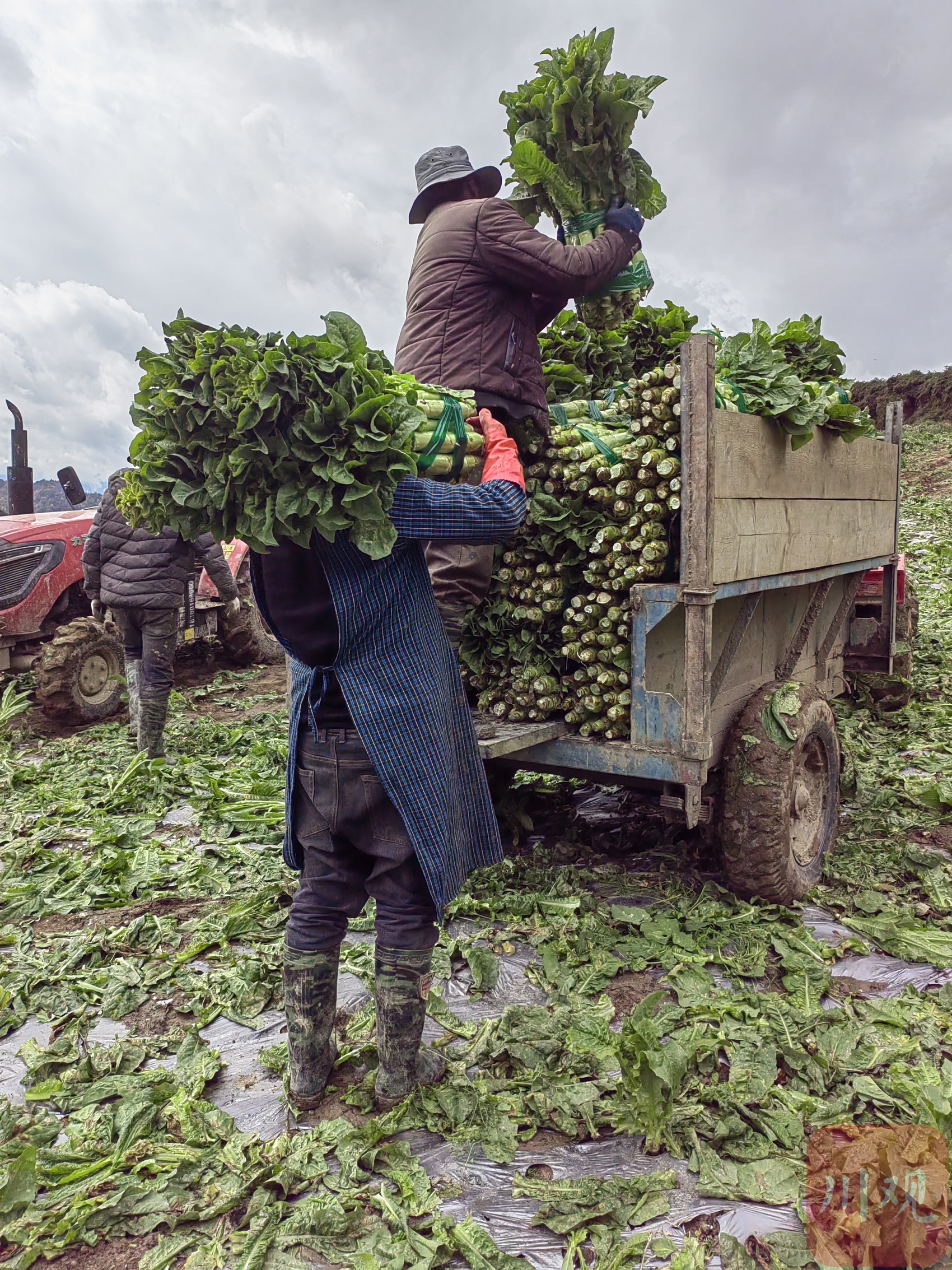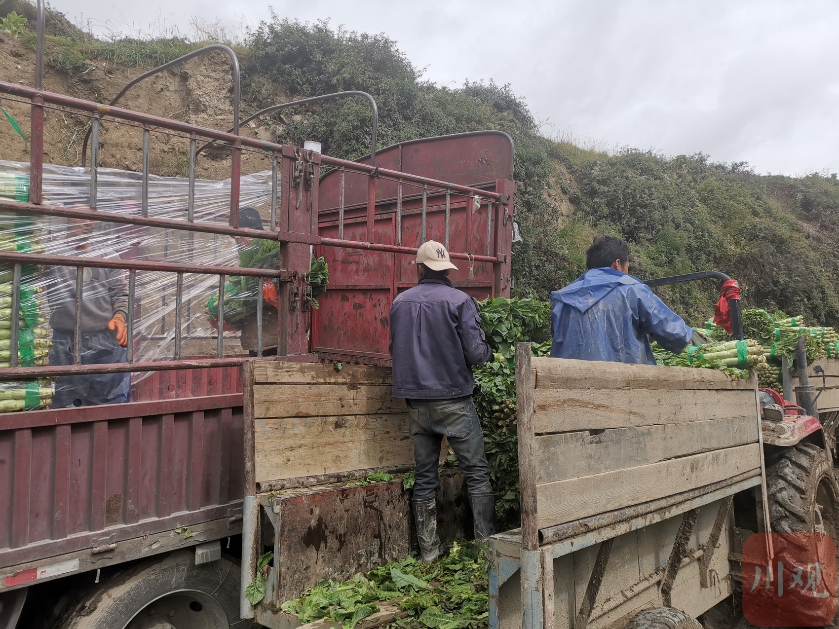 已到中午1点左右,两辆装满莴笋的拖拉机再次从地中央出发,来到梯田上面的村道。村道旁,一辆6.8米的大货车已“整装待发”。“它们赶着拉到成都蒙阳市场。”34岁的村民王介说,从早上7点,20多人忙到现在已经“起”了4亩地。