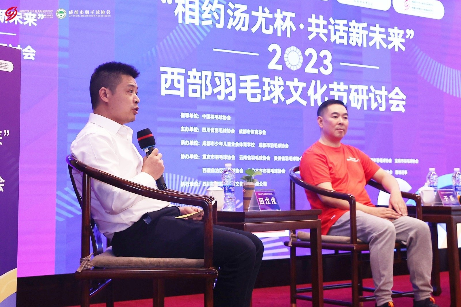 与此同时,“相约汤尤杯·共话新未来”——2023 西部羽毛球文化节研讨会在当天下午同步召开。研讨会上,来自成都市体育局产业处的王光耀以《世界赛事名城建设,激发城市活力新发展》为题发表演讲,从政策、基础建设、发展环境等多方面梳理赛事名城建设脉络;成都羽冠天羽毛球俱乐部总经理何芝锦、羽毛球新锐品牌“的幸”创始人、主理人杨晨,分别就《青少年羽毛球培训模式创新》《运动员转型羽毛球企业,探索羽毛球产业新机遇》为题进行分享。