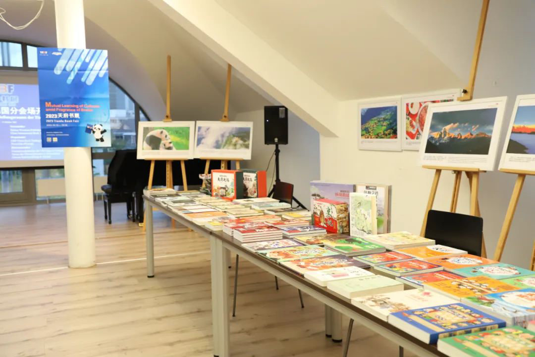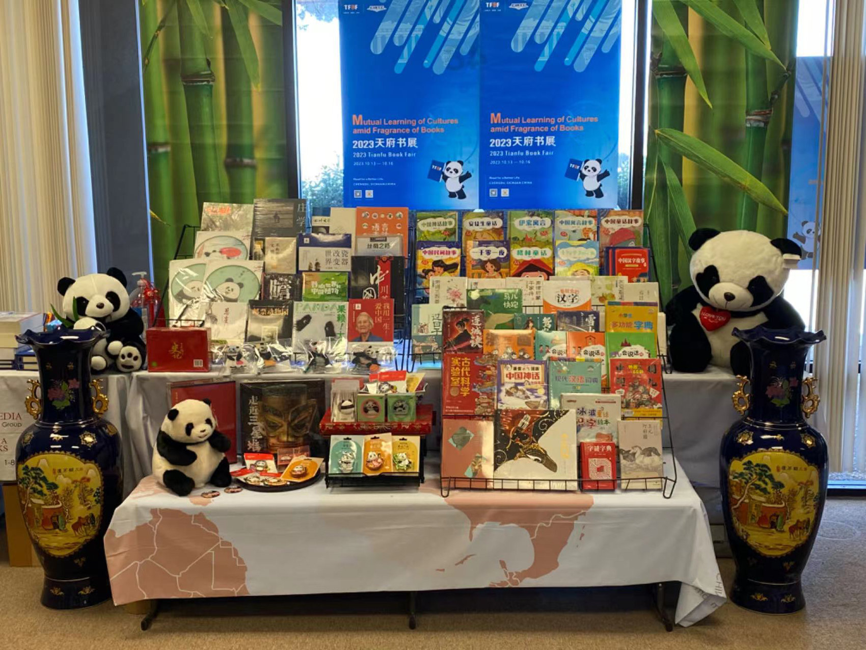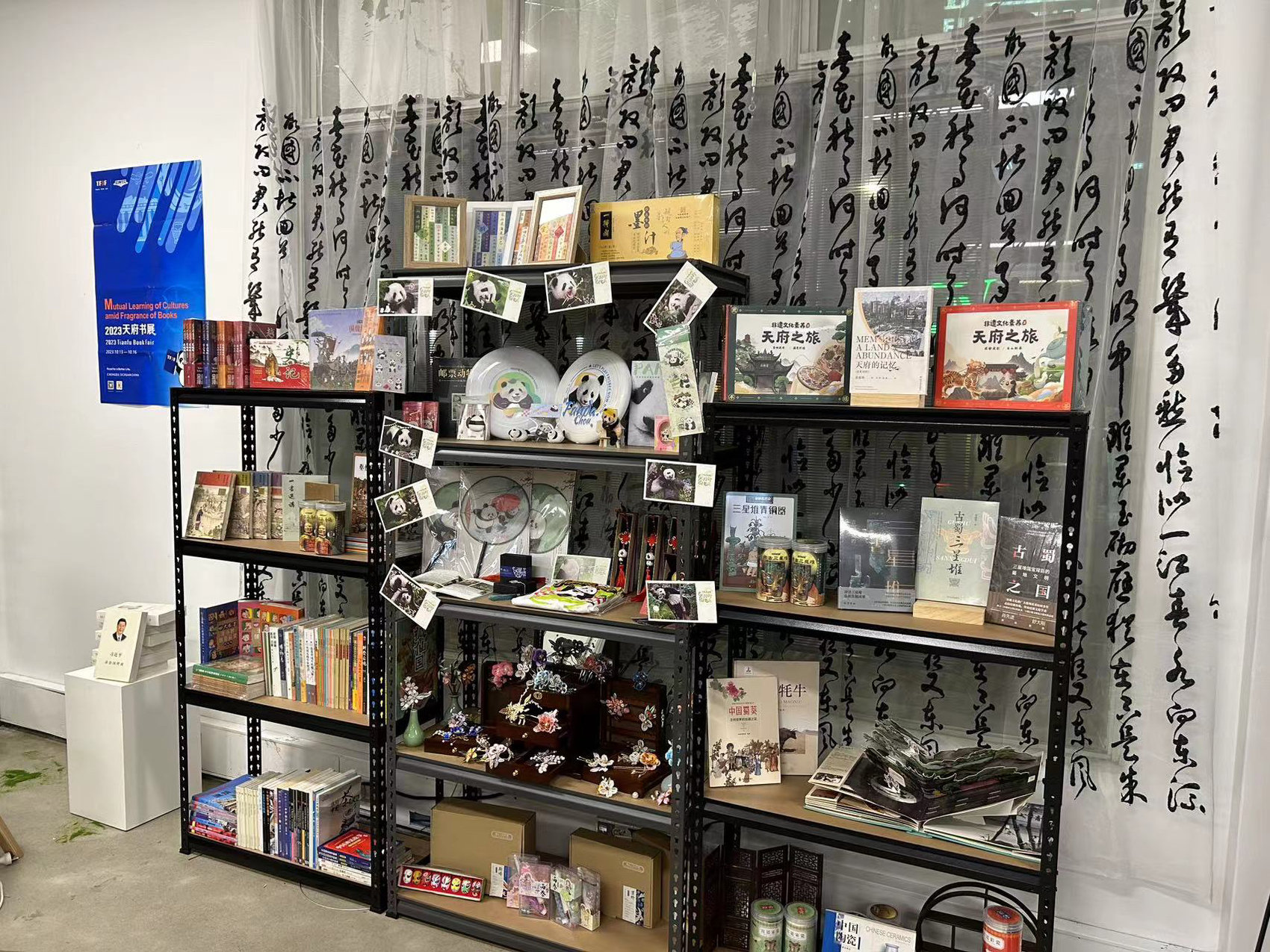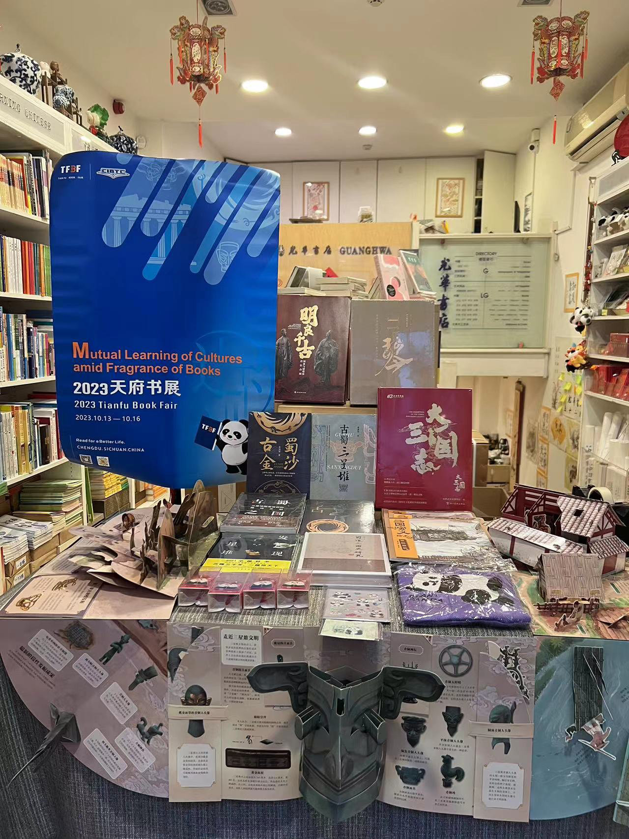 为实现“共享书香 交流互鉴”的海内外联动,2023天府书展首次将分展场延伸到了海外,联合中国国际图书贸易集团、中华书局,以海外华文书店及文化交流场所为据点,在德国、法国、澳大利亚、中国香港等9个国家和地区设立海外分展场,与主展场同期设展,为海外读者带来《我用一生爱中国:伊莎白·柯鲁克的故事》《瓷器改变世界》《熊猫花花》《天府的记忆》《走进三星堆》等川版出版物,体现四川特色的文创产品,如熊猫文创明信片、冰箱贴、团扇等,四川非遗文创道明竹编平安扣、银花丝书签……