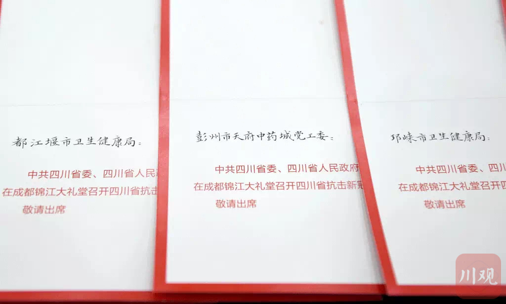 这是他今天写的第92张邀请函,也是他连续伏案书写的第8个小时。从上午8点半开始,四川省书法家协会主席戴跃率领副主席林峤、王道义,以及精于小楷创作的苟建勋、邓长春、吴艾伦等13位书法名家,为即将参加表彰大会的先进个人、先进集体书写1321份邀请函。