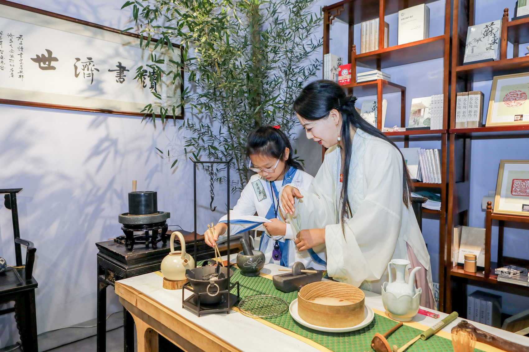 除此之外,全球热销的文具品牌、网红热门的文创产品、新潮前卫的手办盲盒……也是无数年轻人的心头好。主展场内的“草堂书院”,是杜甫草堂文创店的快闪店,他们的帆布袋倒是弥补了读者抢不到“显眼包”的遗憾,此外更有钥匙扣、冰箱贴等“杜甫周边”。而文创展销区的国风馆,现场展示的研习焚香、点茶、挂画、插花,体验传统宋式雅致人文生活,让人们一秒穿越,身边来来往往穿着汉服的人,拉风带感,还有挑货郎、状元郎巡礼现场,有趣的是,不少外国友人也来到这里,大玩变装,穿上汉服,学习中国礼仪,感受中华民族优秀传统文化的魅力。