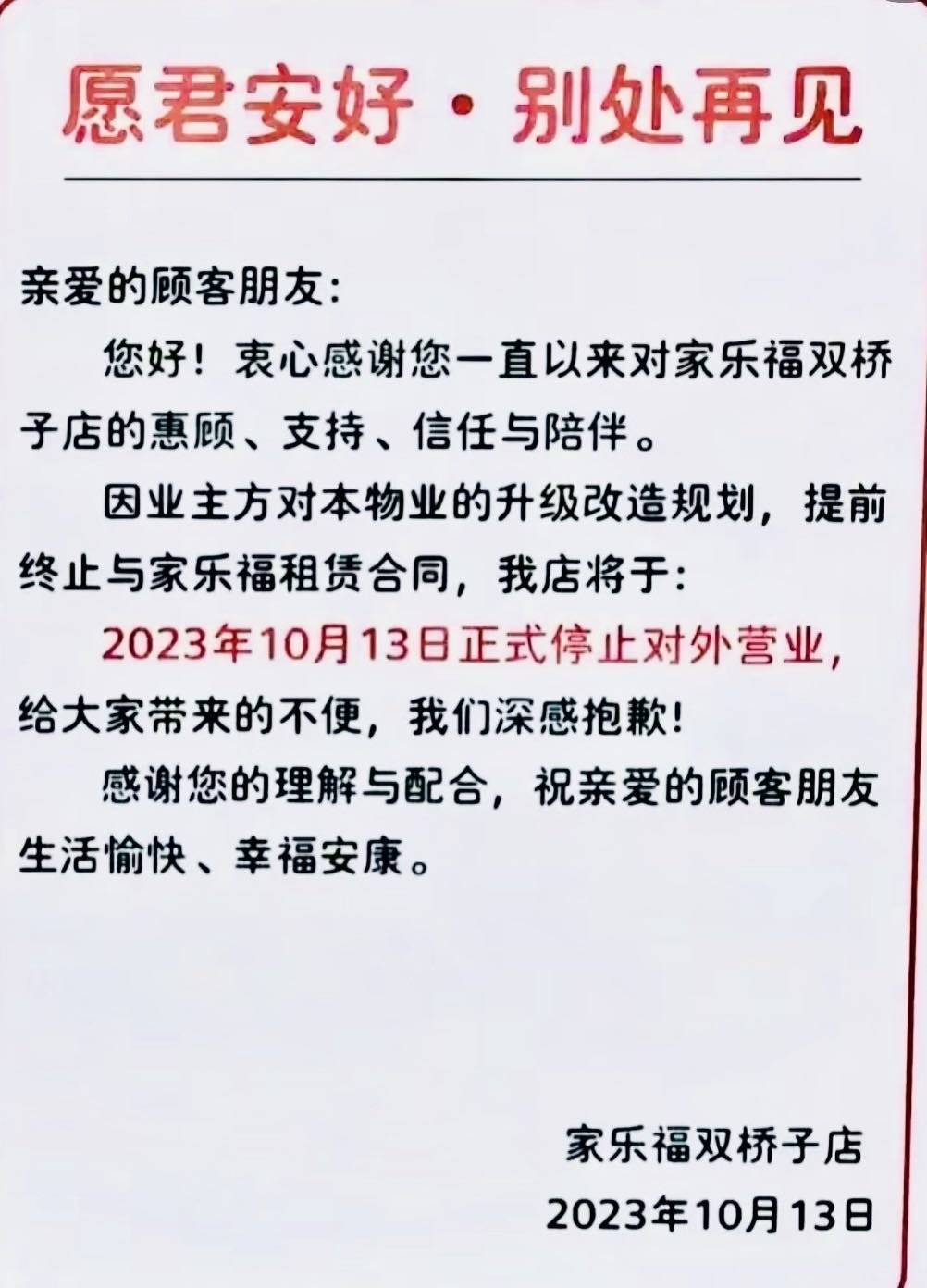 2023年10月13日,成都家乐福双桥子店发布公告,正式停止对外营业。今年9月5日,家乐福温江店宣布停业时,公告就指出成都家乐福正常营业的门店仅剩家乐福双桥子店。如今,随着最后一家家乐福门店的关闭,也意味着家乐福已经退出了成都市场。
