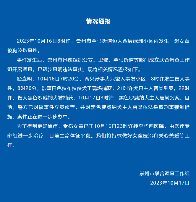 经查明,10月16日7时20分,两只涉事犬只窜入事发小区,8时许发生伤人事件。8时20分,涉事白色拉布拉多犬于现场捕获,21时许犬只主人贾某到案。22时许,伤人黑色罗威纳犬被捕获;10月17日3时许,黑色罗威纳犬主人唐某到案。目前,警方已对该事件立案侦查,并对黑色罗威纳犬主人唐某依法采取刑事强制措施。案件正在进一步侦办中。