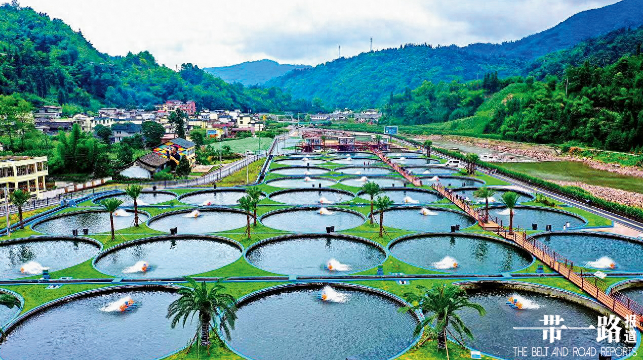 阳光下,一座座圆形养殖池如一颗颗绿宝石逐一排开,各类品种的鲟鱼在欢快游动,不时溅起阵阵水花。