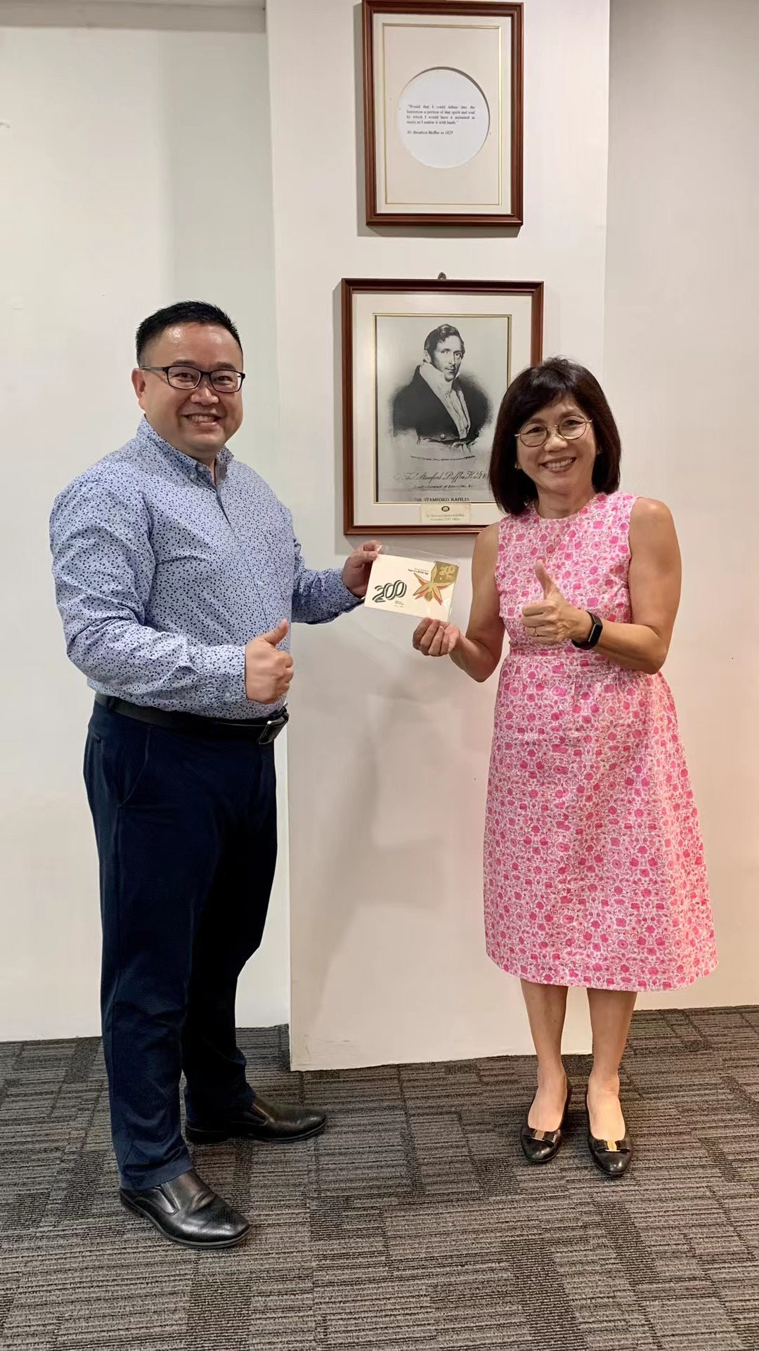 赵光普(左)领取莱佛士书院建校200周年纪念章。