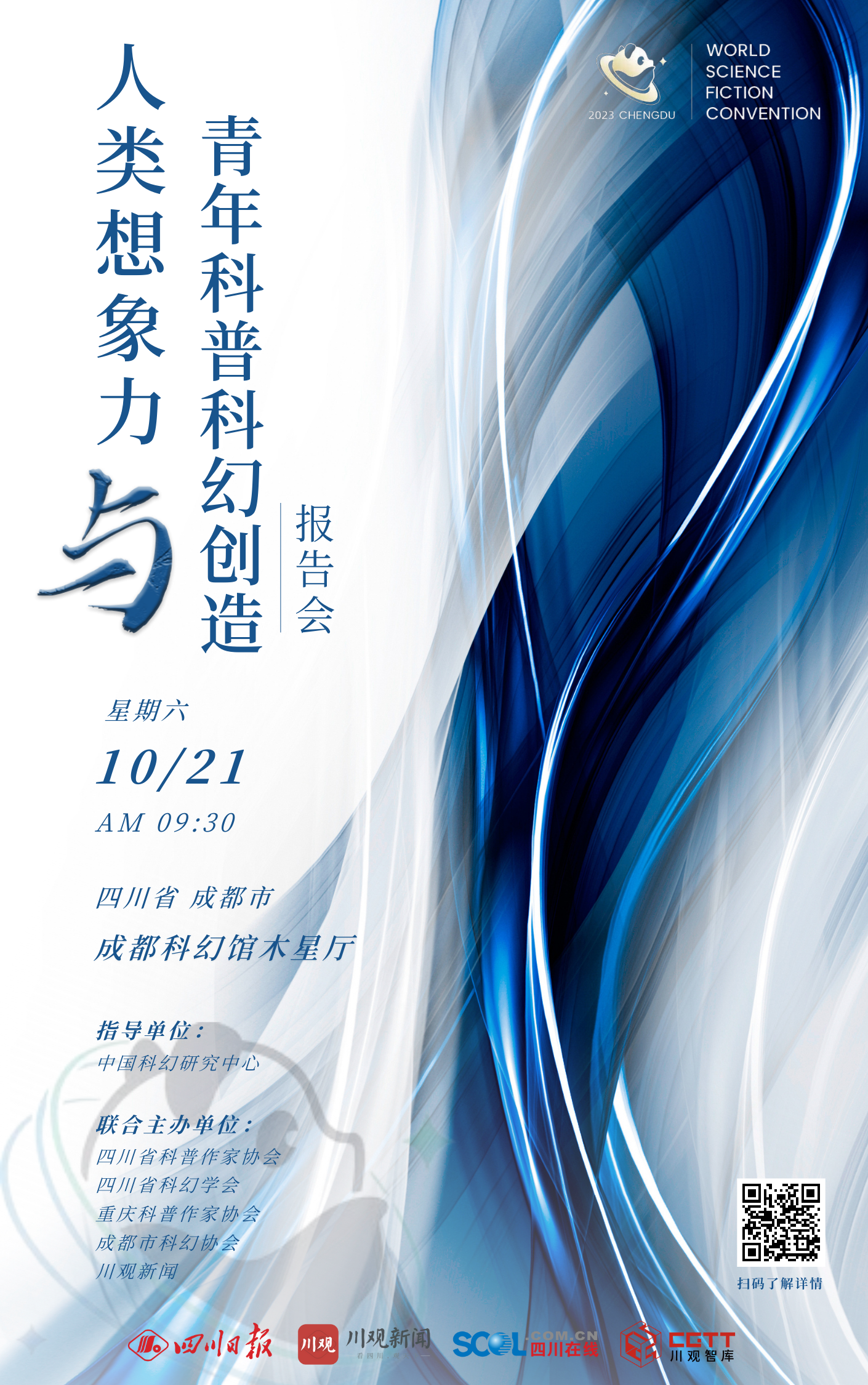 10月18日,2023成都世界科幻大会将正式开幕。作为世界最高规格科幻盛会,一系列主题沙龙、主题展、签售会、粉丝派对等活动将在2023成都世界科幻大会期间相继登场。其中,由中国科幻研究中心指导,四川省科普作家协会、四川省科幻学会、重庆科普作家协会、成都市科幻协会、川观新闻联合主办的“人类想象力与青年科普科幻创作报告会”定于10月21日上午9时30分在成都科幻馆木星厅举行。