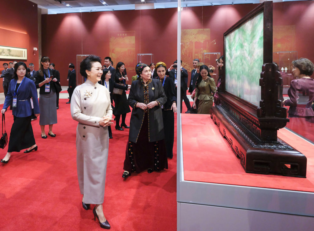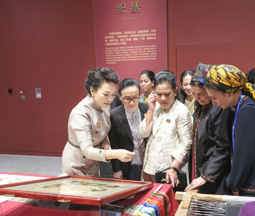 10月18日上午,国家主席习近平夫人彭丽媛邀请出席第三届“一带一路”国际合作高峰论坛的外方领导人夫人参观中国工艺美术馆(中国非物质文化遗产馆)。