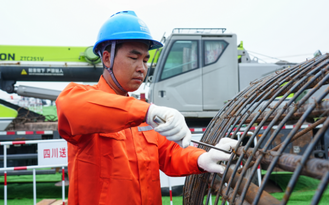 10月18日,电力工人在工程(川3标)N6205号塔位加固绑扎钢筋笼。谭谢阳 摄