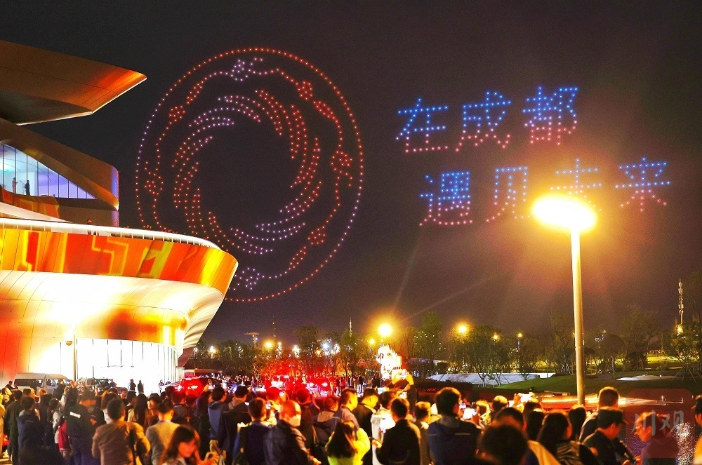 以蓝白色的灯光为主色调,1000架无人机编队飞上天空,15分钟的表演里,不停变换队型,依次展现恒星诞生、黑洞、星河等画面,随后,立体的2023成都世界科幻大会吉祥物“科梦”显现于天空,最后呈现出太阳神鸟和“在成都遇见未来”字样……配合着绚烂的水幕灯光秀,观众纷纷举起手中的手机,记录下这美妙一刻。