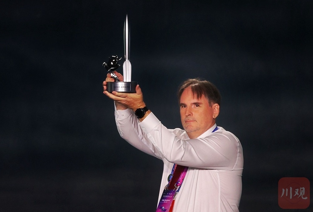 当晚的开幕式上,2023雨果奖奖杯底座,在雨果奖评选组组长戴夫·麦卡蒂手中揭开面纱。底座的设计图案为一只从时空隧道探出头来的熊猫,名叫“华豹”,此刻它正仰望着火箭向未来招手,向科幻致敬。这也是中国文化元素第一次出现在雨果奖奖杯的底座上。
