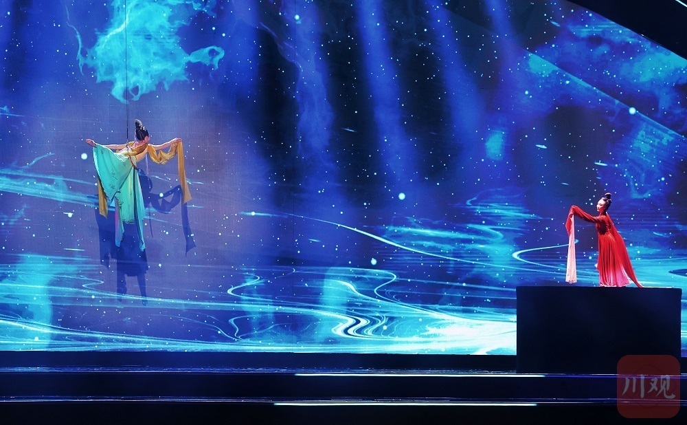 在开幕式倒计时环节,大屏幕上最先浮现出了太阳神鸟金饰,它代表着古蜀人的飞天梦想。在科幻秀《揽星》中,古蜀文化和科幻同样交相辉映。9个“三星堆纵目青铜人”随音乐展现铿锵有力的舞步,舞蹈演员身后的大屏幕上,青铜面具在上下纷飞的“0”“1”数字中慢慢浮现。随后,“飞天玄女”“从天而降”,旋转、舞动,展现出中国自古以来对未知世界的幻想和憧憬。