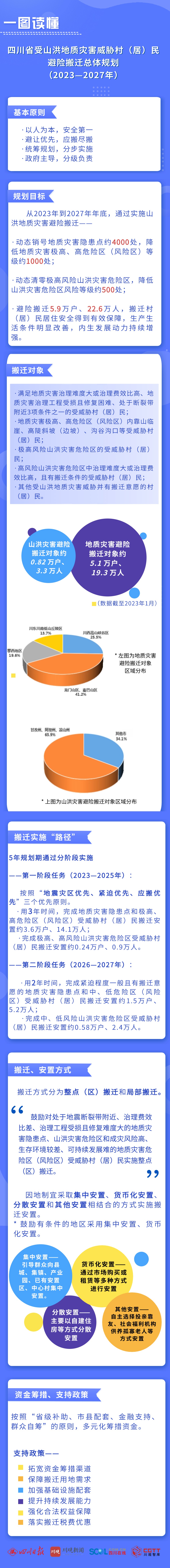 日前,四川省人民政府办公厅印发《四川省受山洪地质灾害威胁村(居)民避险搬迁总体规划(2023—2027年)》(以下简称《总体规划》),提出从今年起到2027年,将通过实施山洪地质灾害避险搬迁,动态销号地质灾害隐患点约4000处,动态清零极高风险山洪灾害危险区,降低地质灾害极高、高危险区(风险区)等级约1000处、山洪灾害危险区风险等级约500处,避险搬迁安置受威胁村(居)民约5.9万余户、22.6万人。