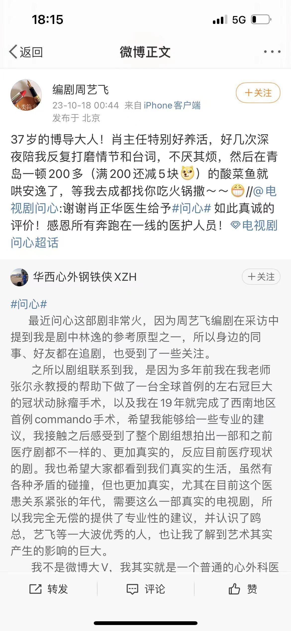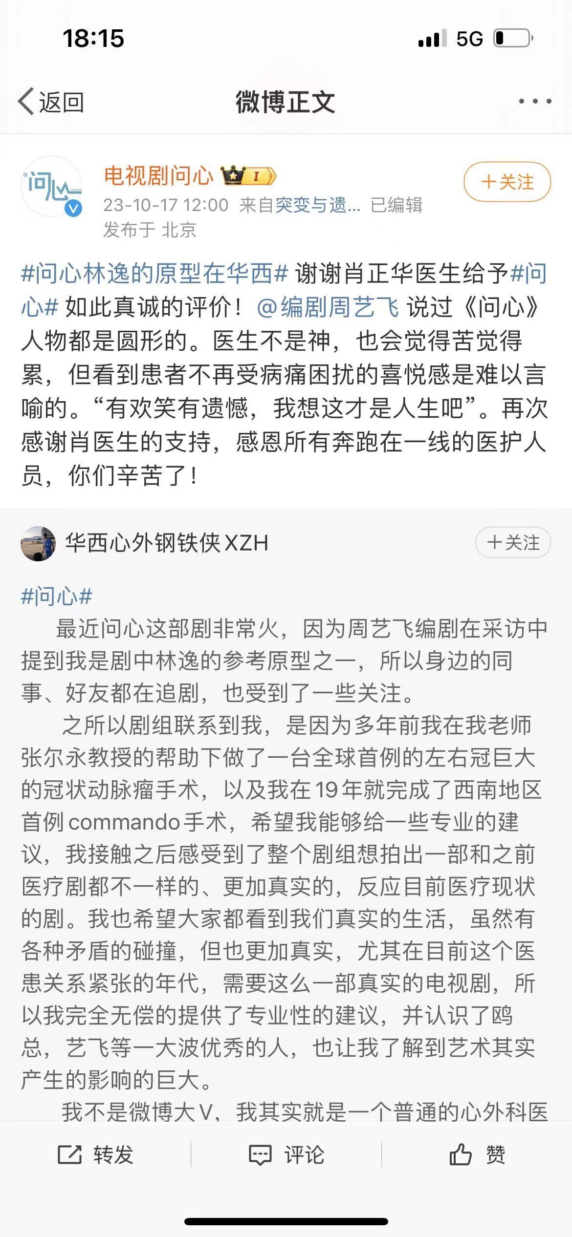 电视剧《问心》剧组、编剧周艺文转发华西心外科肖正华医生是“剧中林逸的参考原型之一”的相关微博,发文感谢肖医生的支持。