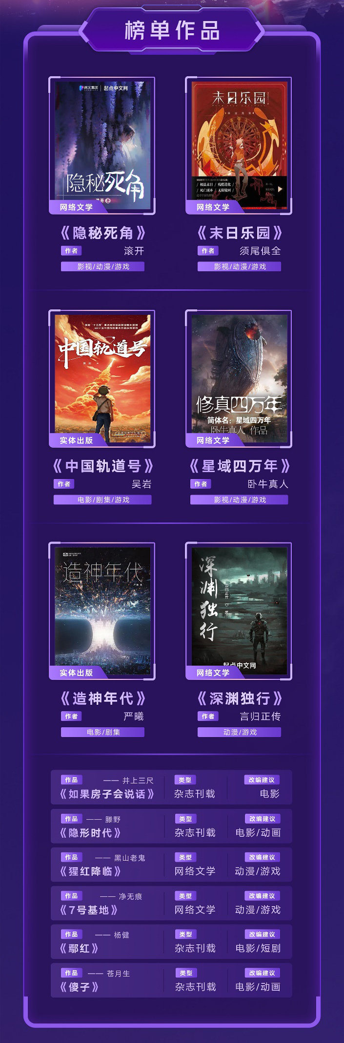 本次榜单共有包括《隐秘死角》《末日乐园》《中国轨道号》《星域四万年》《造神年代》《深渊独行》在内的12部作品上榜。