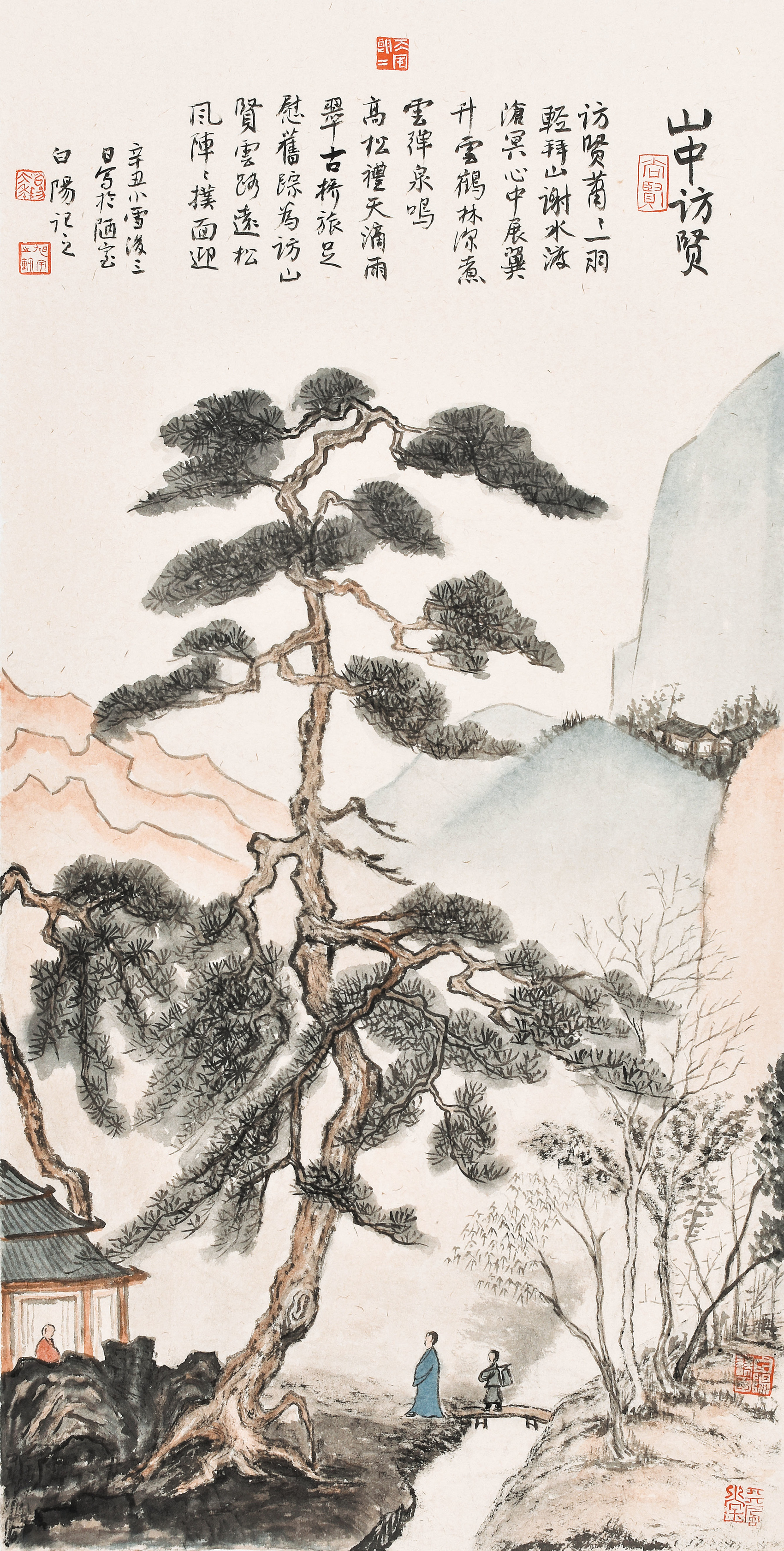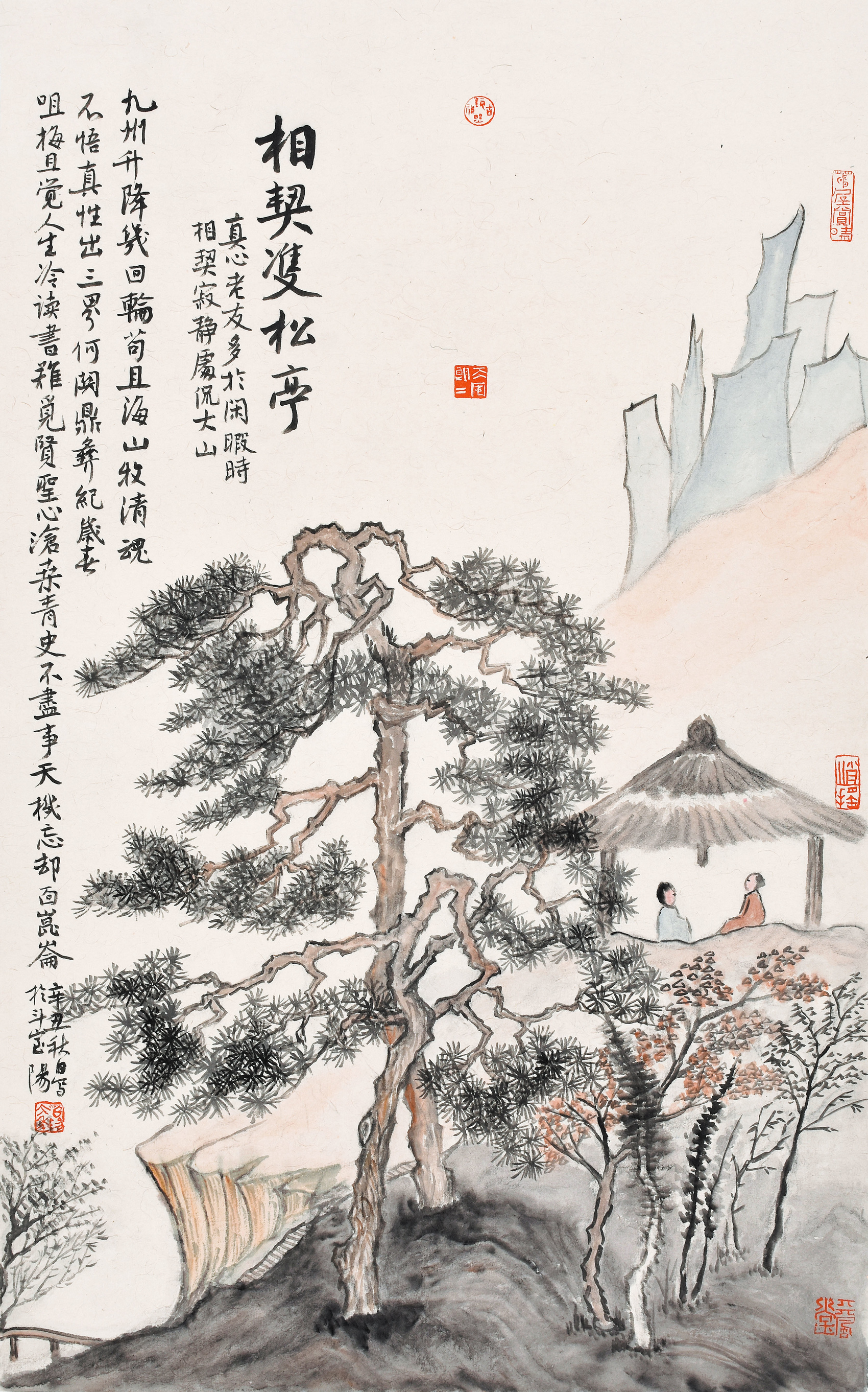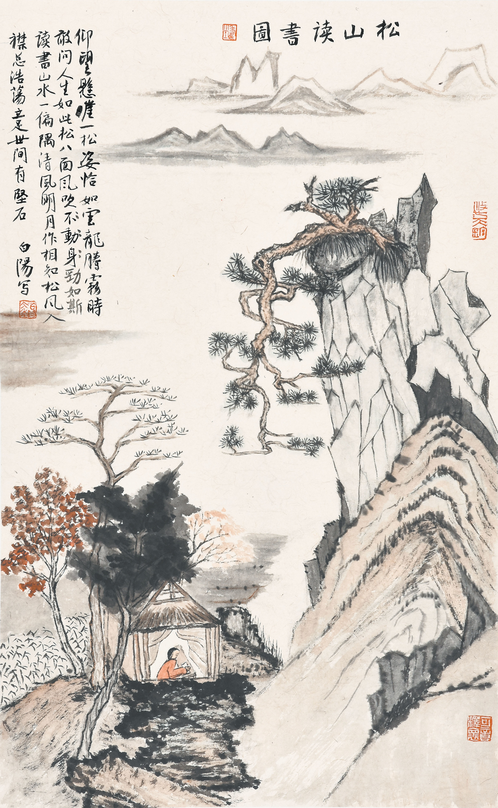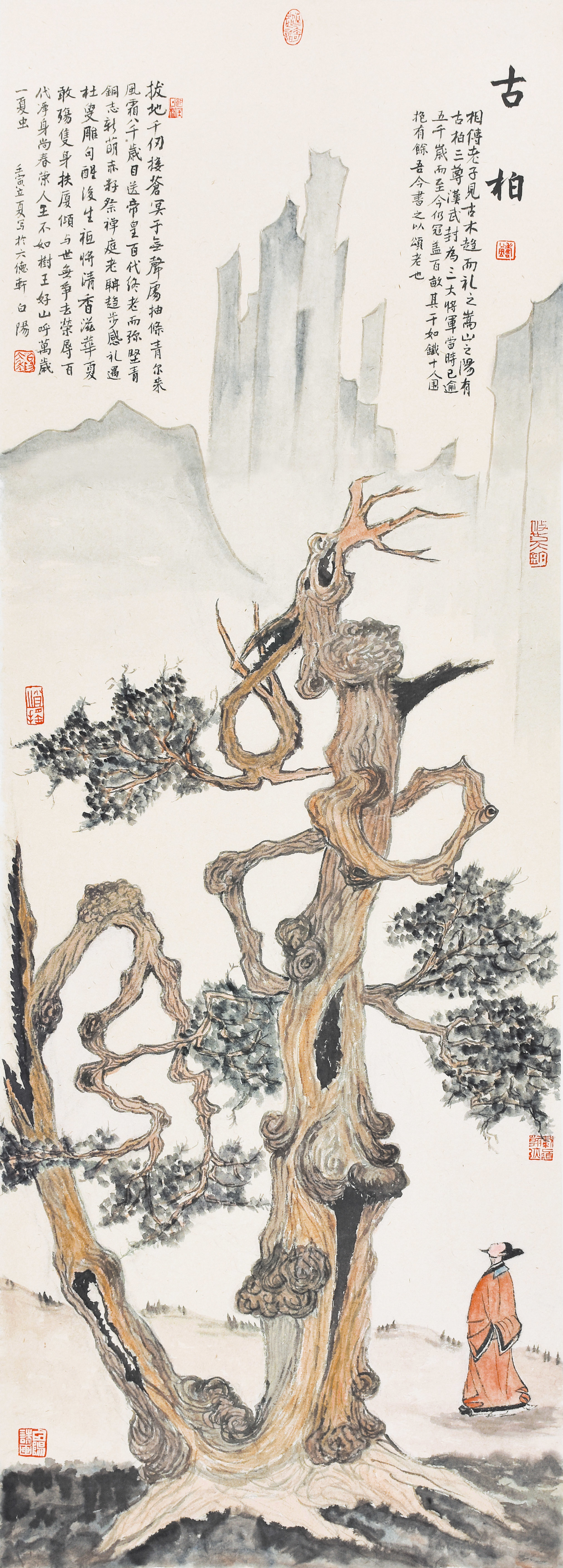 在具象描绘方面,遒劲老树、策杖仙人、巨石沟壑等眼中之物,他不渴求照片式复制,画得逼真不是意趣所在,画出肌理效果更不是终极目标,而是以书法入画的笔意,对景造意,不取繁饰,却能写出真山、真石、真树的形骨,才是以形取神而神形兼备的艺术理念。