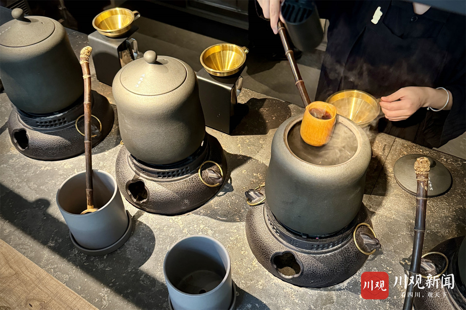 经过提前打磨茶叶、手冲萃取、炭火煮制的风味茶汤。