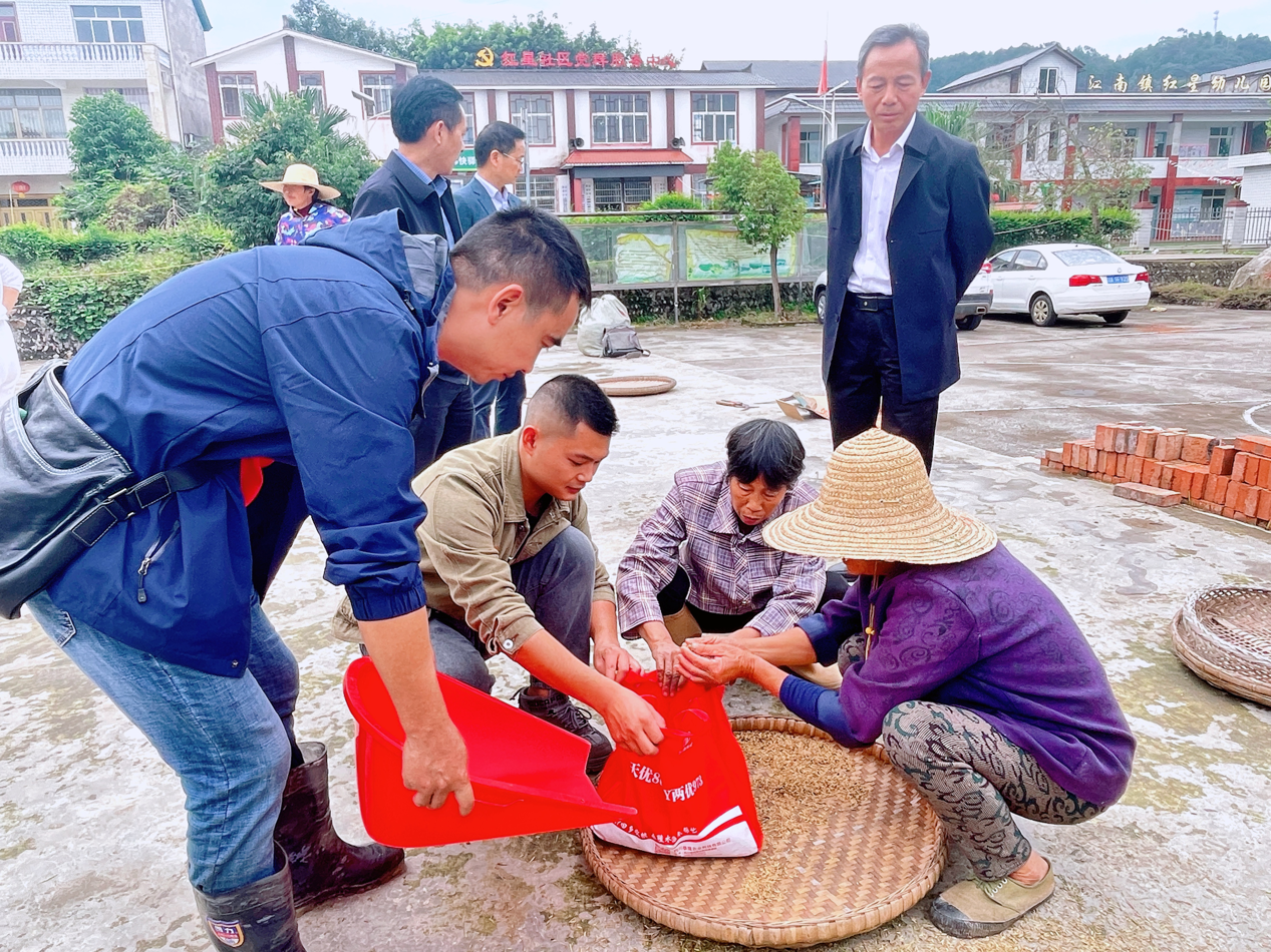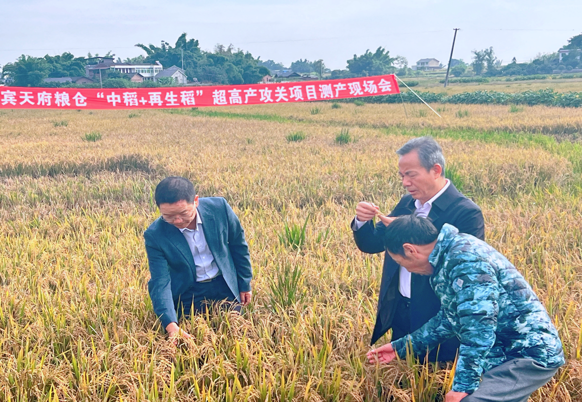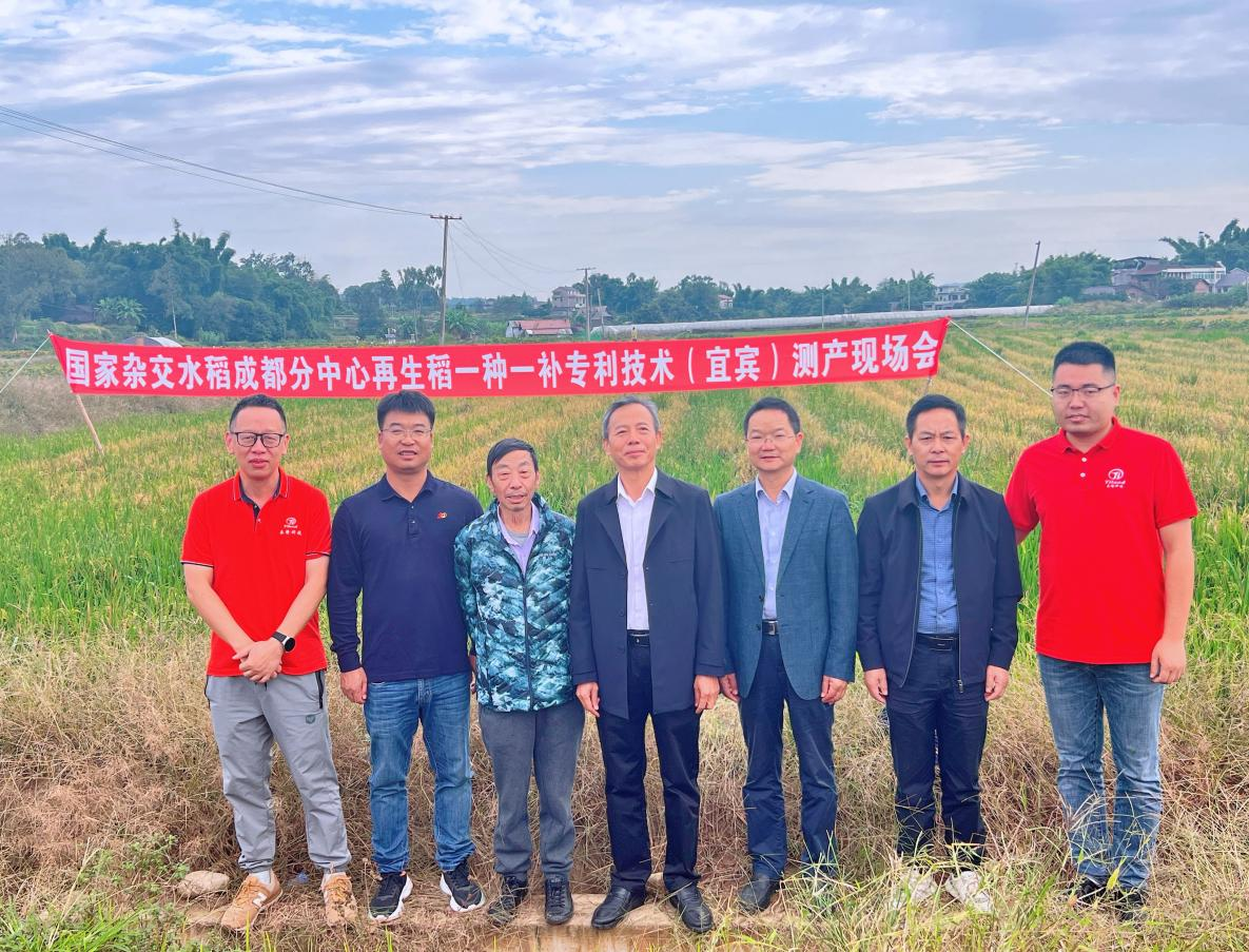 当天,四川省农村科技发展中心组织了由国家杂交水稻工程技术研究中心、四川农业大学、四川省农业科学院、重庆市农业科学院、宜宾市农业科学院等单位专家组成的专家组,对位于三江新区的“中稻+再生稻”高产攻关示范片的再生稻进行了现场测产验收。该示范片引进采用了袁隆平院士科研团队最新“再生稻一种一补增产增效”专利技术,测产验收专家组按照农业农村部超级稻测产方法,随机抽取了3块田进行收割,实测平均亩产为317.13公斤 ,该高产攻关片之前中稻测产验收平均亩产为806.97公斤,本次“中稻+再生稻”合计平均亩产为 1124.10 公斤。