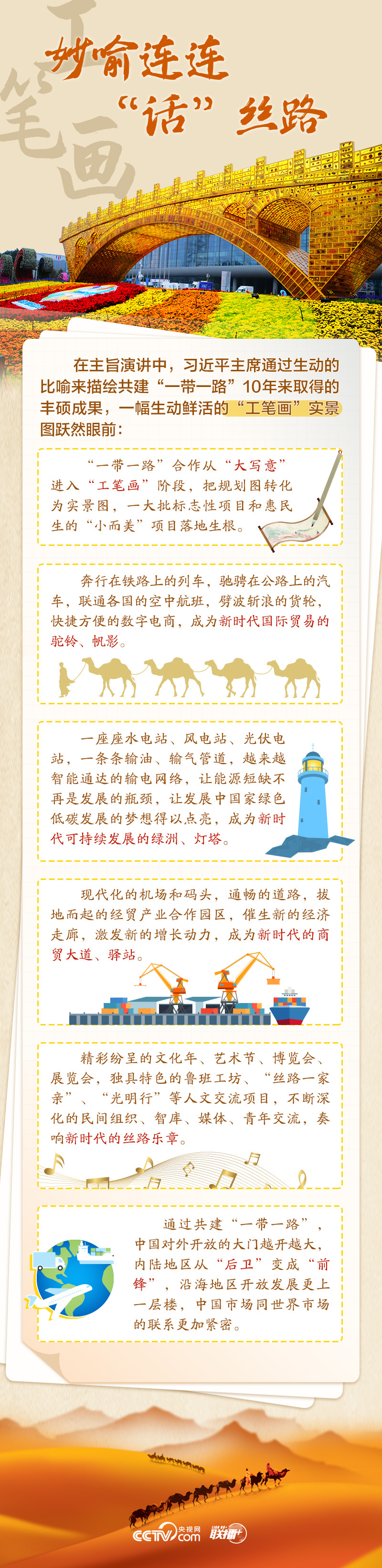 站在共建“一带一路”倡议走过十年这个标志性节点,这幅“工笔画”呈现怎样的实景图?高质量共建“一带一路”如何再出发?央视网《联播+》栏目从五个维度为您速读习主席讲话,与您一同学习。