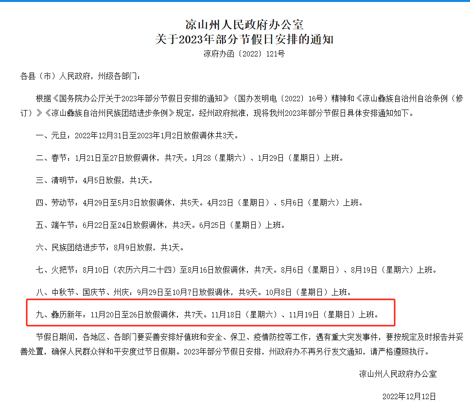 根据凉山州人民政府办公室关于2023年部分节假日安排的通知(凉府办函〔2022〕121号):