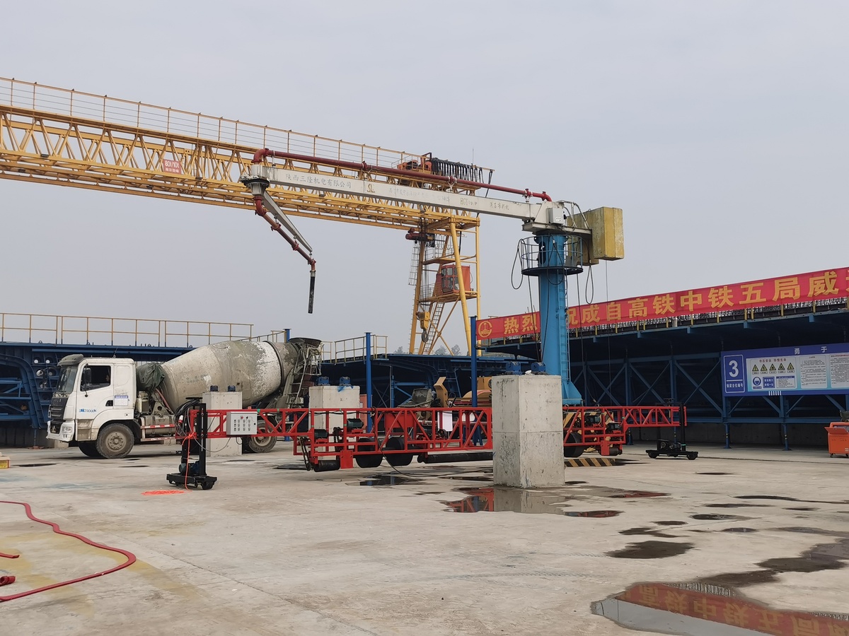 据介绍,首榀箱梁长32米、宽12.6米、高3.05米、重820余吨,于当天13时56分在成自高铁威远制梁场内开始灌注混凝土。经过6个多小时的连续施工,顺利完成了首榀箱梁的预制。该梁场位于威远县高石镇伞岭村与兰田村的交界处,共占地160余亩,自2019年11月下旬开始施工,承担着成自高铁项目内江段577榀梁的制造架设和供26.89公里无砟道床建设的原料生产任务。