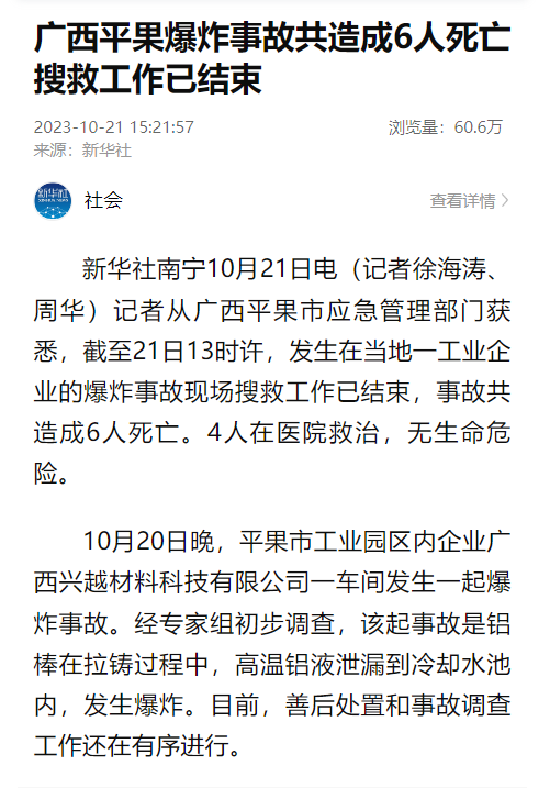 10月20日晚,平果市工业园区内企业广西兴越材料科技有限公司一车间发生一起爆炸事故。经专家组初步调查,该起事故是铝棒在拉铸过程中,高温铝液泄漏到冷却水池内,发生爆炸。目前,善后处置和事故调查工作还在有序进行。