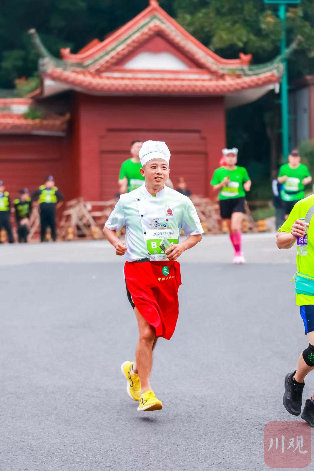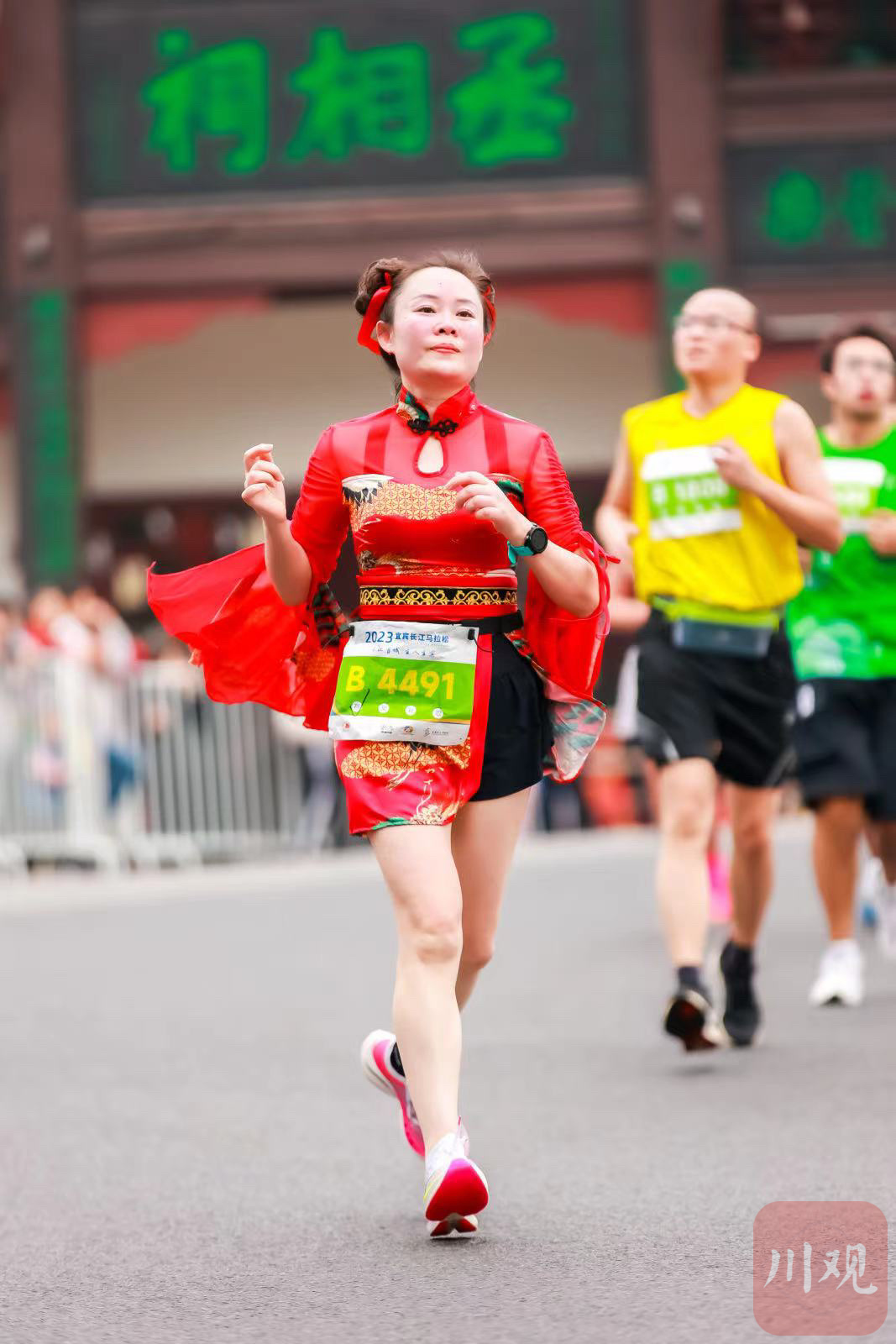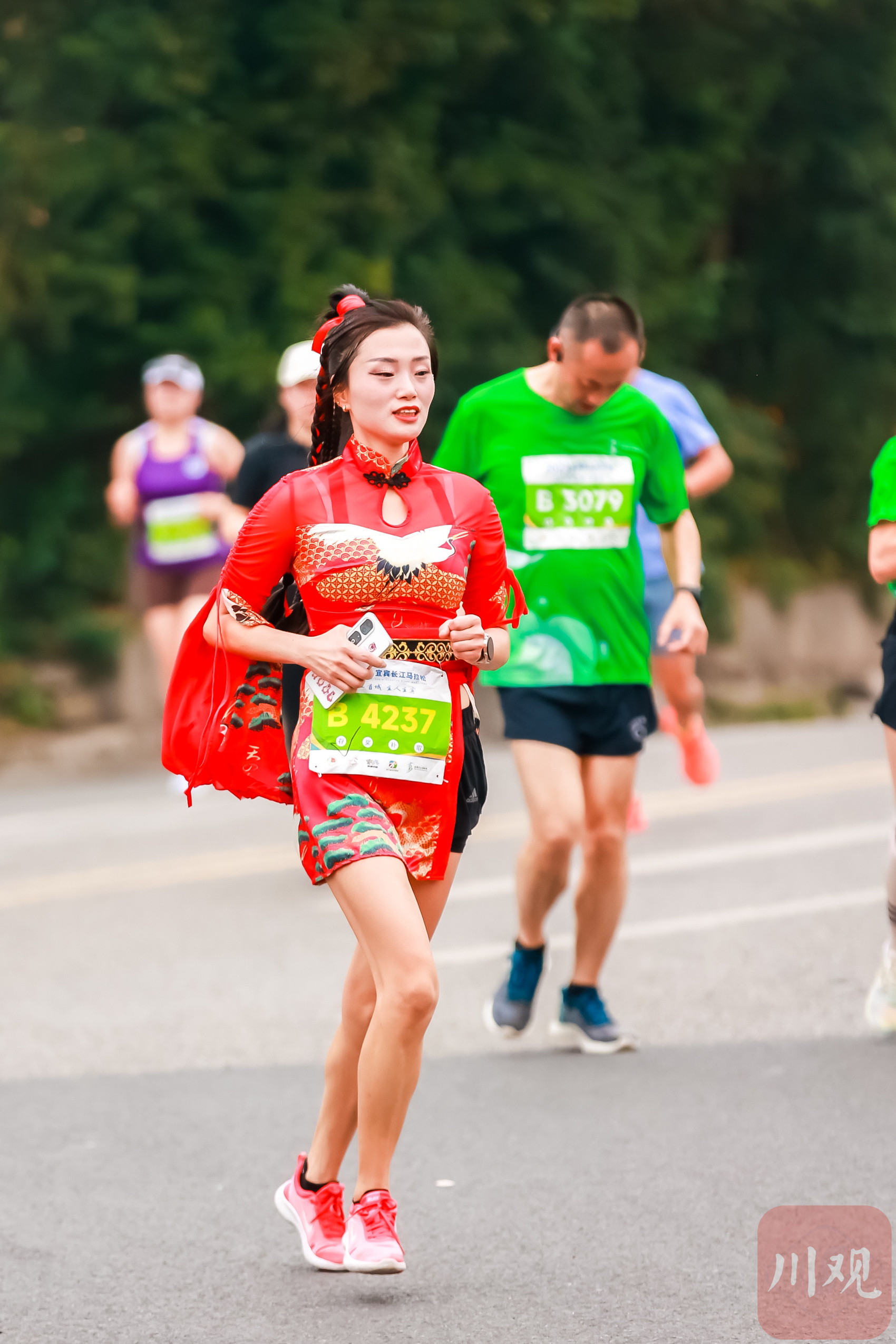 参加马拉松比赛的选手中,有不少选择“盛装”参赛,既有传统服饰,也能看见新潮特色。半程马拉松男子组选手王超穿着一身“哪吒”套装冲过终点线时,引来不少关注的目光。王超说,想到哪吒,就想起了孕育了哪吒的宜宾,也就想到了“风火轮”。“幸运的是,今天自己的成绩也像哪吒一样,踩着‘风火轮’,自己很满意。”