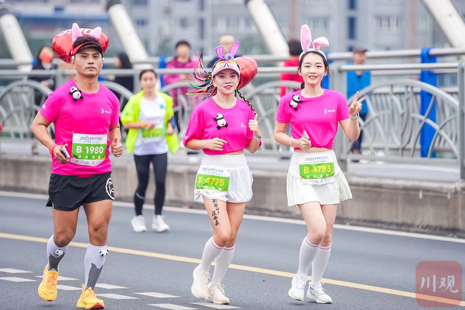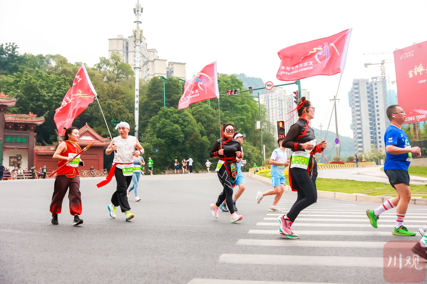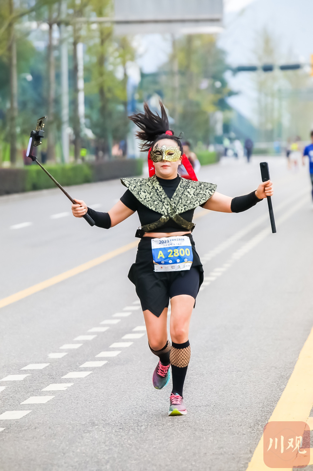 参加马拉松比赛的选手中,有不少选择“盛装”参赛,既有传统服饰,也能看见新潮特色。半程马拉松男子组选手王超穿着一身“哪吒”套装冲过终点线时,引来不少关注的目光。王超说,想到哪吒,就想起了孕育了哪吒的宜宾,也就想到了“风火轮”。“幸运的是,今天自己的成绩也像哪吒一样,踩着‘风火轮’,自己很满意。”