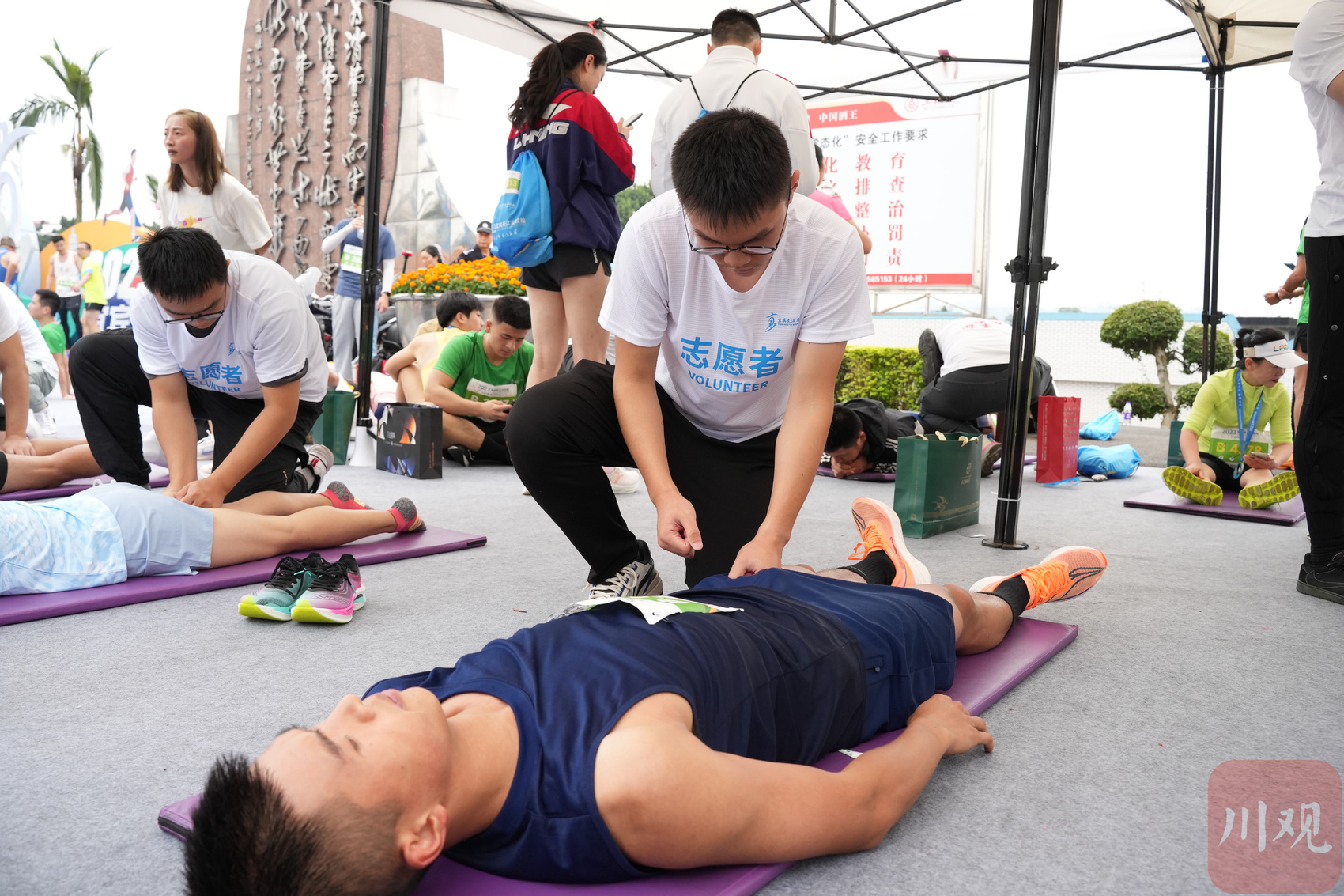 来自宜宾学院体育与大健康学院的大学生志愿者何铭科,在赛场旁为完赛的选手提供拉伸、放松等服务。学习运动康复方向的他和十余位同学一起,在马拉松比赛前接受了集中培训,为运动员们提供专业、有效的舒展服务。“主要是帮助他们进行腿部拉伸,尽快放松肌肉。”