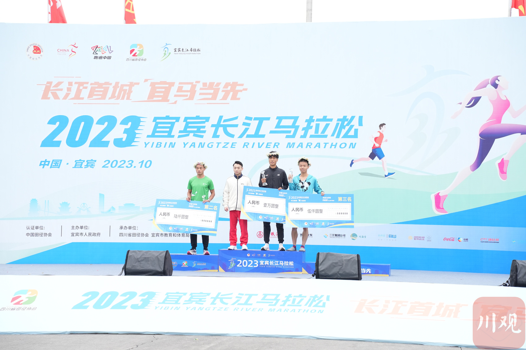 3个多小时后,2023宜宾长江马拉松颁奖仪式在五粮液集团有限公司东大门旗标广场举行,半程马拉松男子组、女子组,全程马拉松男子组、女子组获奖选手相继上台领奖。为了充分调动市民群众、学校师生、民间跑团的参赛积极性,比赛组委会拿出25万元奖金作为奖励,并设置了宜宾市民奖。