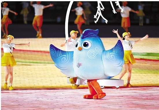 与演员共舞的“飞飞”、运动员入场时在人群中跳跃的“飞飞”……大家会因为它的出现,绽放出快乐的笑容。