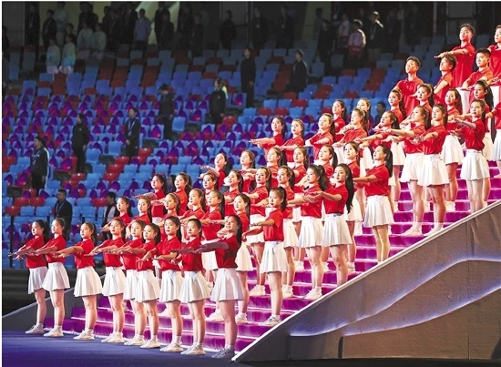 手语方阵“唱”国歌。 记者 王建龙 摄