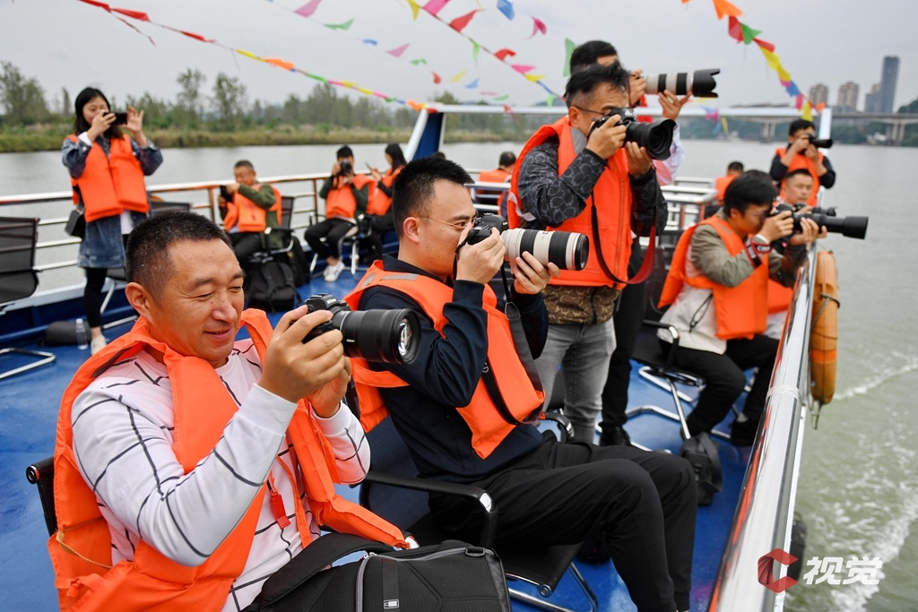 摄影师在嘉陵江上拍摄“千里嘉陵江水色,百里绿道揽怀中”的盛景。