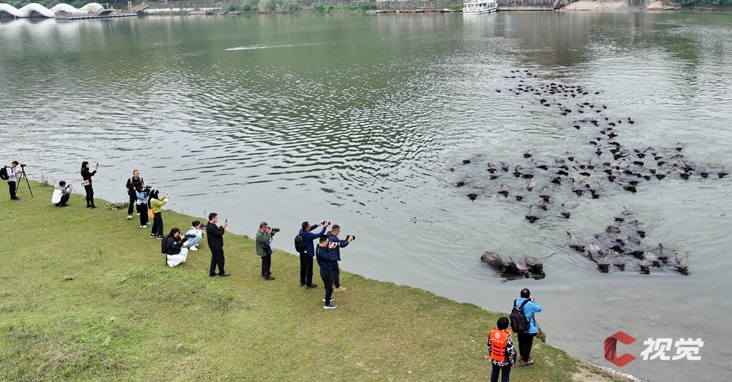 上百头水牛浩浩荡荡地游过嘉陵江去觅食,摄影师们争相拍摄嘉陵江上的独特生态奇观。