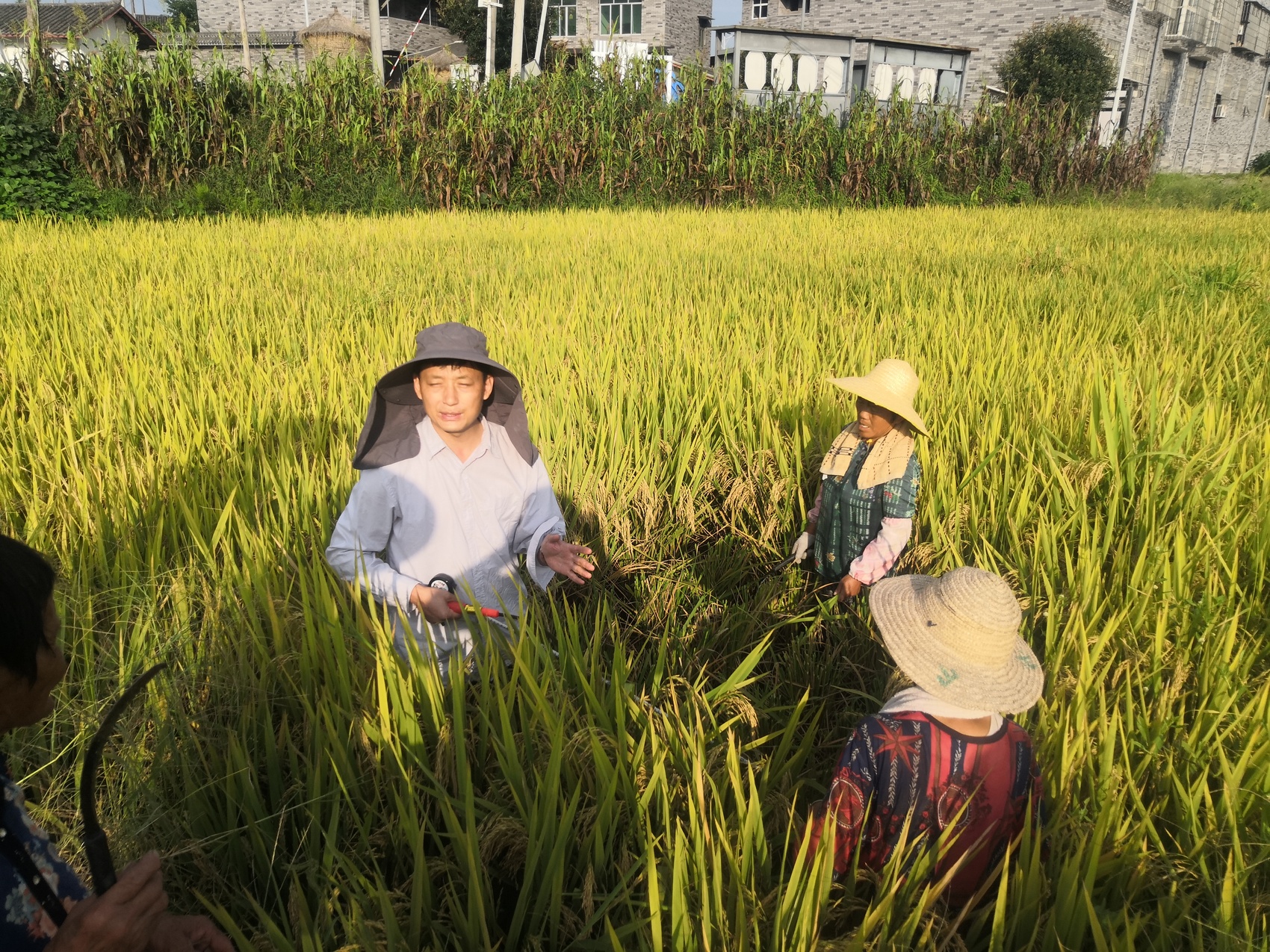 代寺镇乡村振兴发展顾问魏丕伟博士带领村民收割优选新品种水稻。图片由富顺县委组织部提供