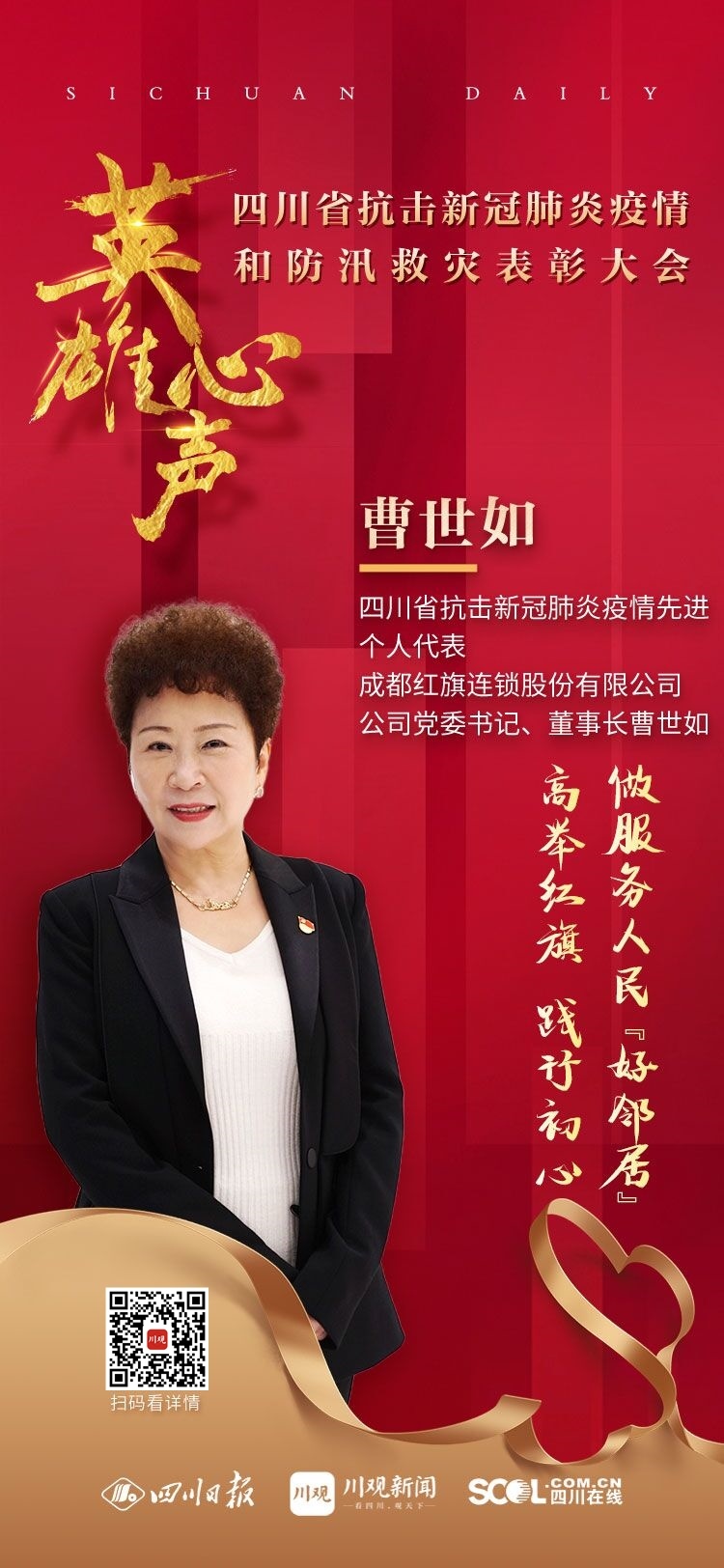 我生在新中国,长在红旗下,20岁入职红旗商场。20年前创建带领红旗连锁一路走来,始终坚持“服务大众、方便人民”初心使命,秉承“来源社会、回报社会”企业精神,以“好邻居”身份,在川开设3300家直营超市,解决了17000就业,年服务消费超4亿人次,2019年上缴税收及社保超5亿元。新冠肺炎疫情发生以来,公司党委坚决听从党的号令,在政府的指导下,发动全体员工坚守工作岗位,服务人民生活,做到门店不打烊、配送不断流、商品不涨价,全力保障生活必需品供应,让战疫的“红旗”高高飘扬。