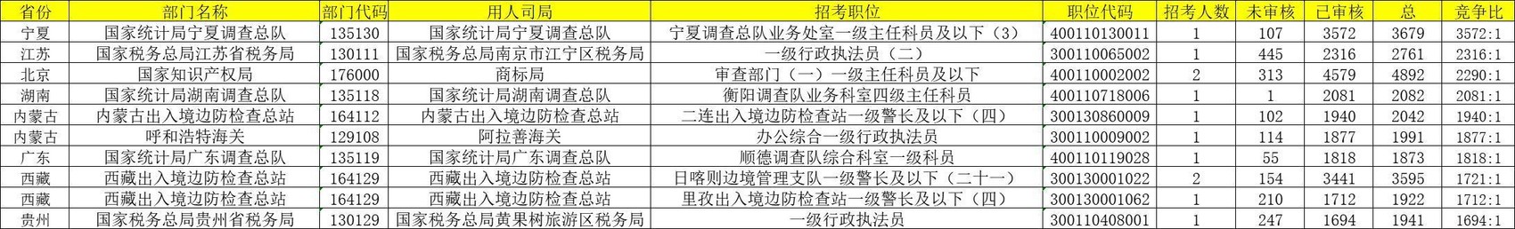 2024年国考最热门的岗位莫过于“国家统计局宁夏调查总队业务处室一级主任科员及以下(3)(400110130011)”一职,竞争比高达3572∶1。该岗位只招1人,但从报考的第三天开始就一直稳居榜首,连续“霸榜”八天。