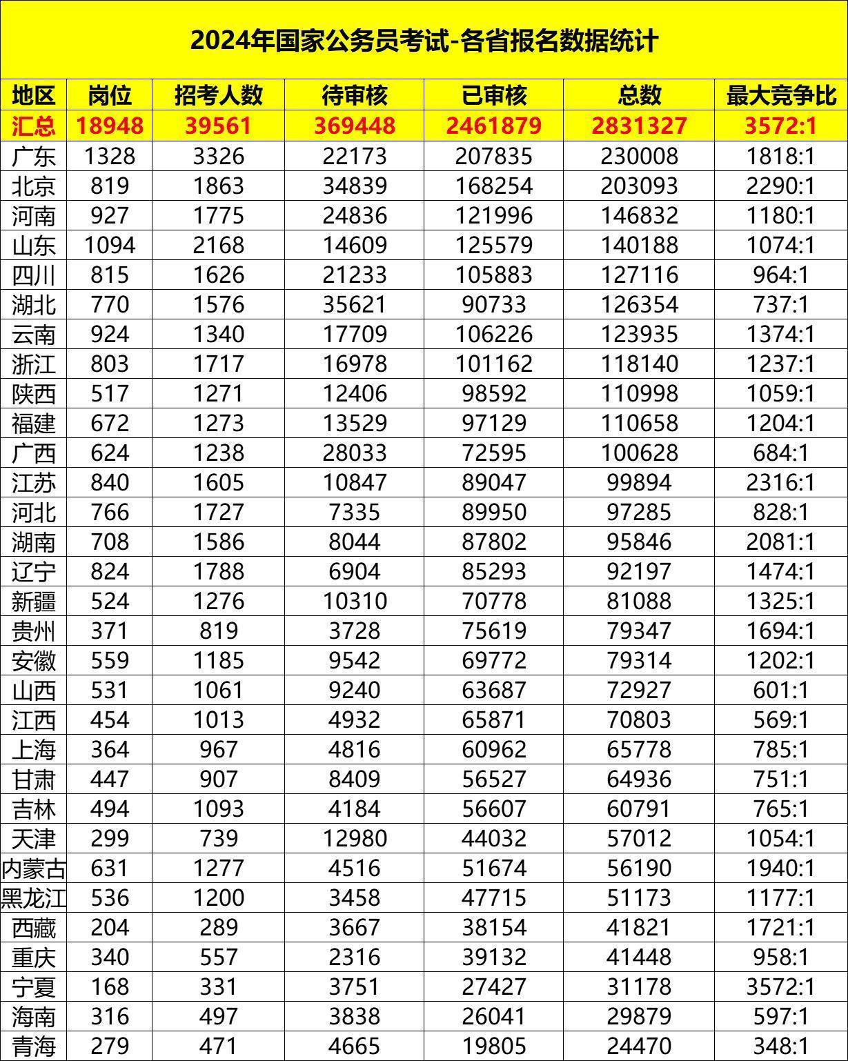 在报名的最后一天,广东省的职位报名人数达到了230008人,过审人数超过20万,遥遥领先于其他地区。其次是北京市和河南省,总报名人数分别为203093人和146832人。青海的职位以24470人的报考人数成为排名末位的地区,同时最大竞争比也处于最后一名,仅为348∶1。