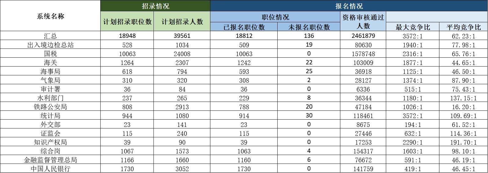 总体来看,国税以1578748人的审核人数“独占鳌头”;平均竞争比最大的系统为统计局,高达191∶1,也就是说,平均每个岗位均有近200人竞争。