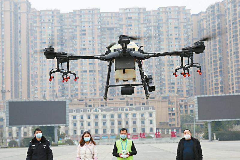 2月18日,内江市东兴区西林街,志愿者正在用无人机巡逻监控。