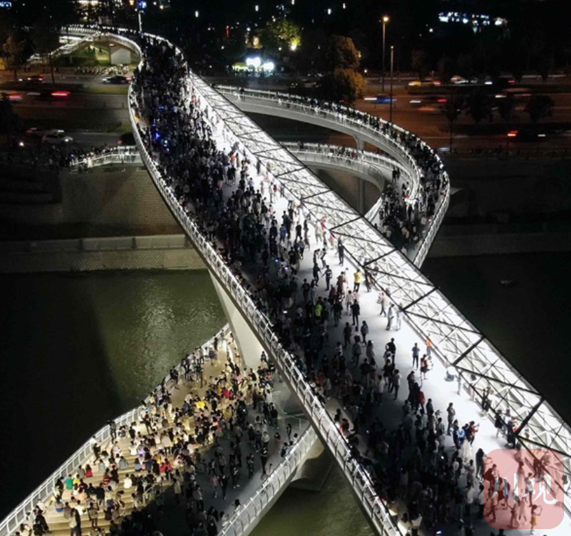 城市醒来,IFS的爬楼大熊猫、横跨锦江的五岔子大桥、洞穴造型的几何书店等“网红”之地,吸引了不少年轻人前来“打卡”;